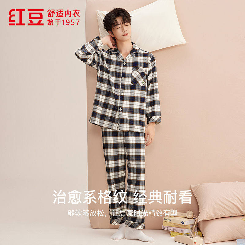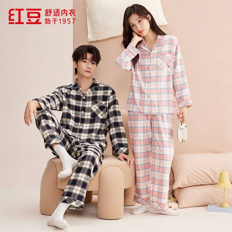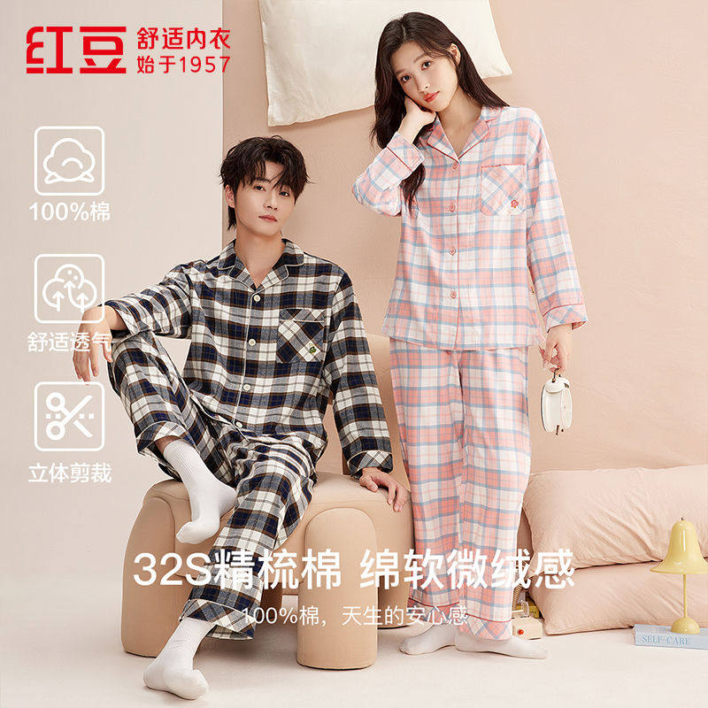 红豆男女士100%精梳全棉舒适透气格纹睡衣套装情侣磨毛秋冬居家服