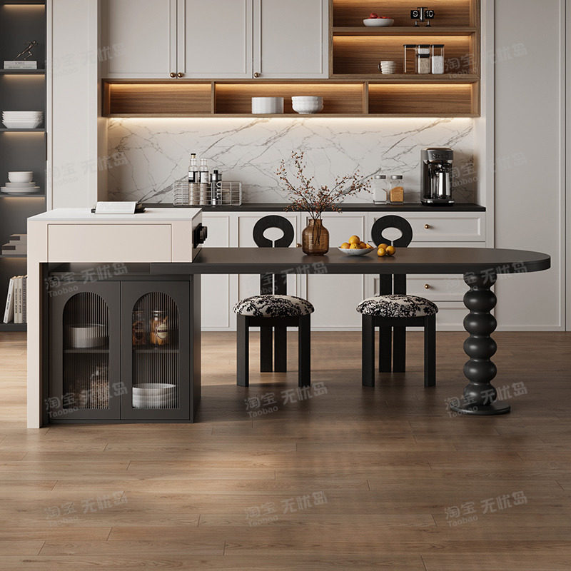 法式复古中古风半圆可伸缩岛台餐桌一体家用多功能圆弧岩板靠墙岛