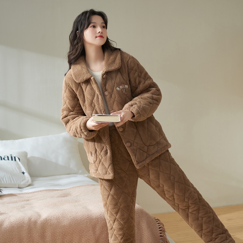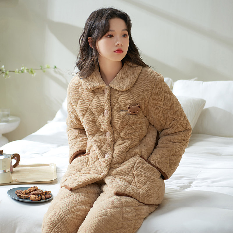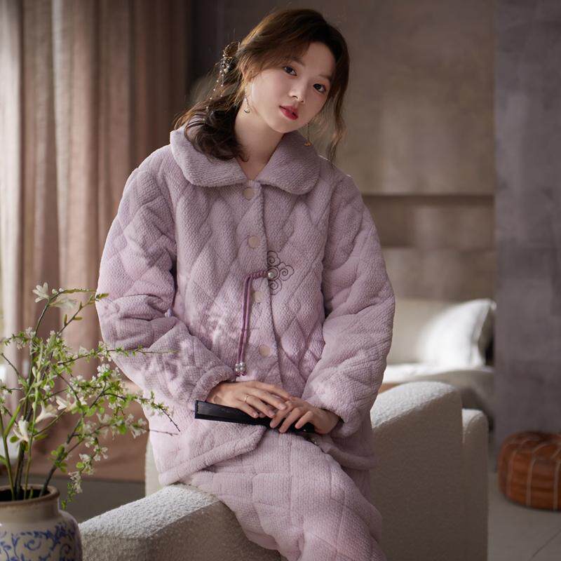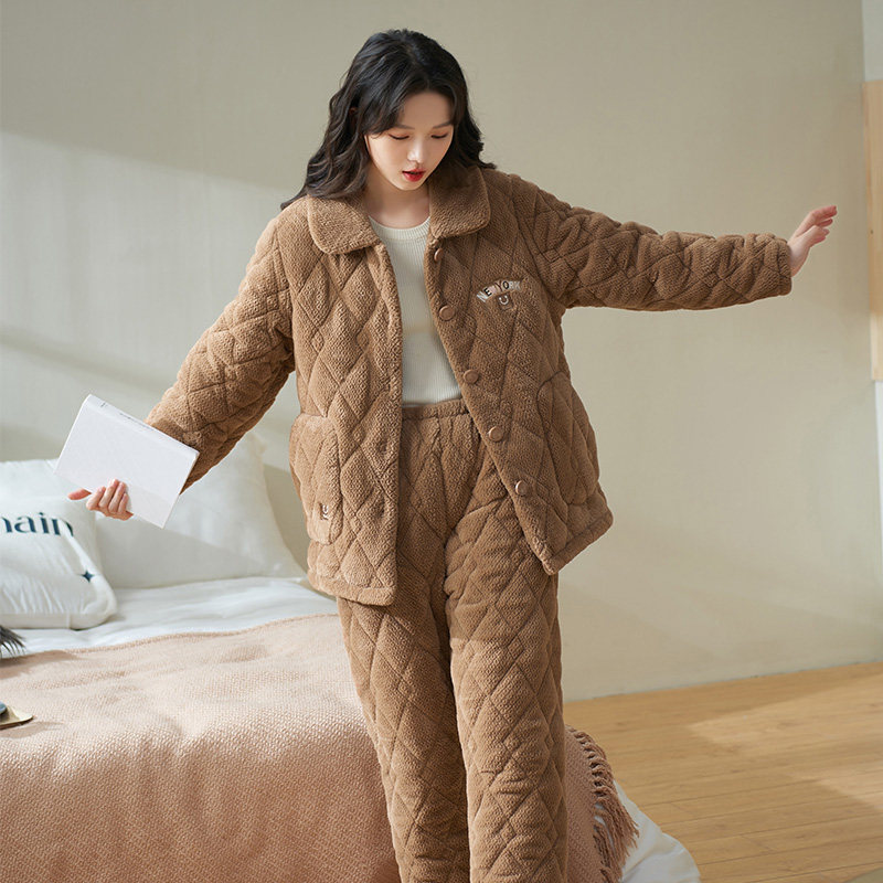 三层夹棉睡衣女冬季新款珊瑚绒加绒加厚保暖套装可外穿冬天家居服