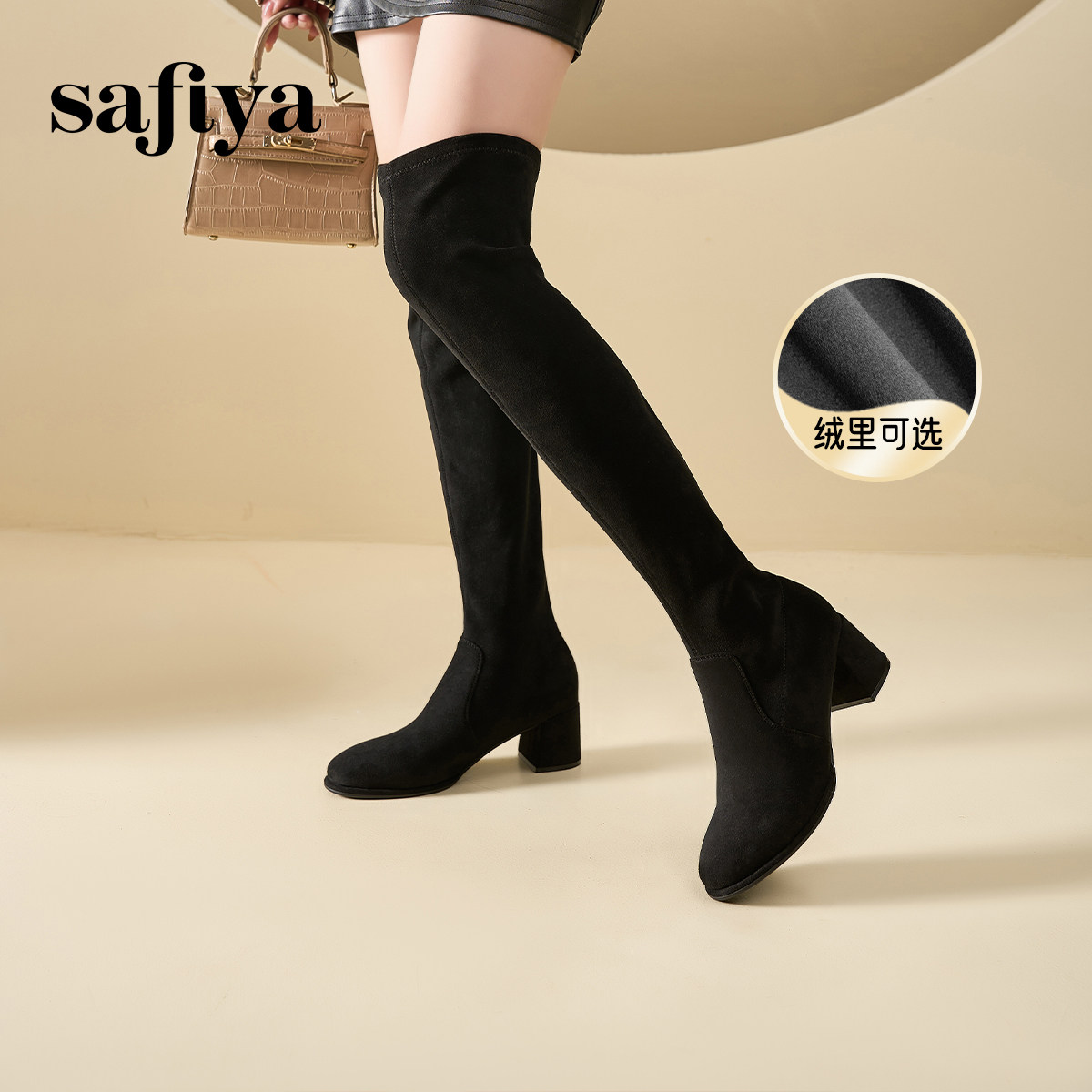 Safiya/索菲娅秋冬休闲显瘦圆头百搭弹力高跟不掉筒过膝长靴女
