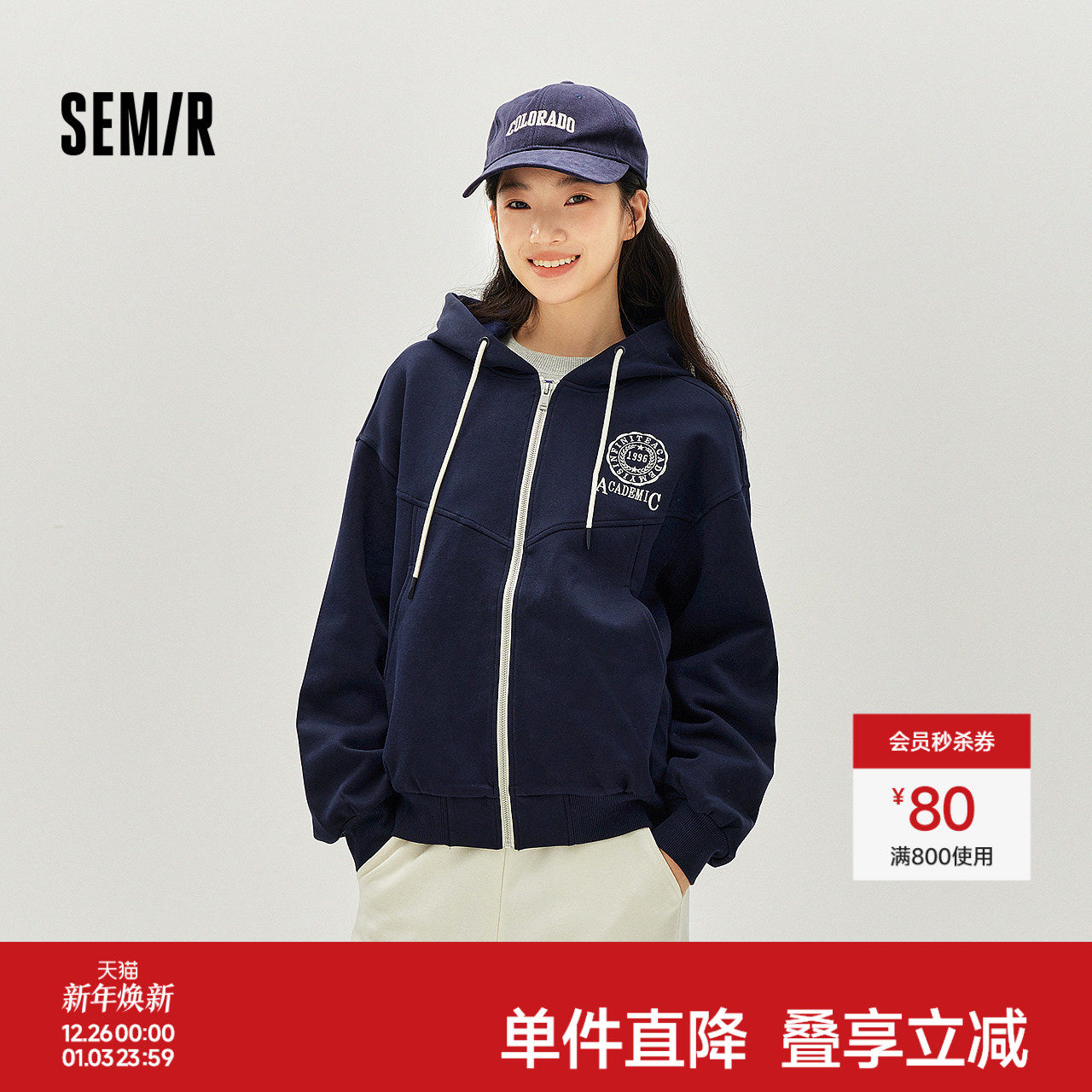 森马外套女春季连帽字母刺绣宽松落肩质感夹克分割气质学院风上衣