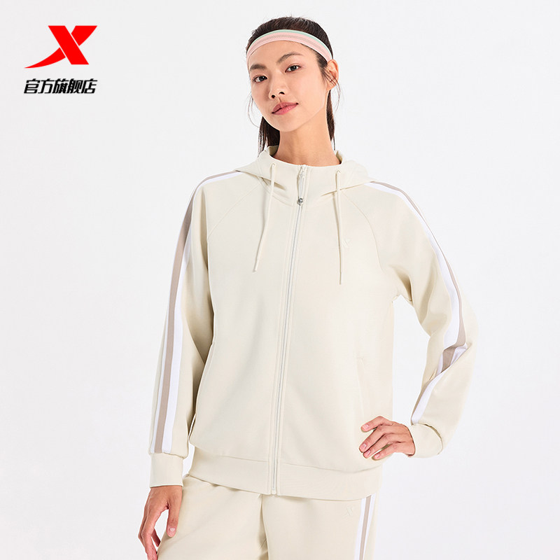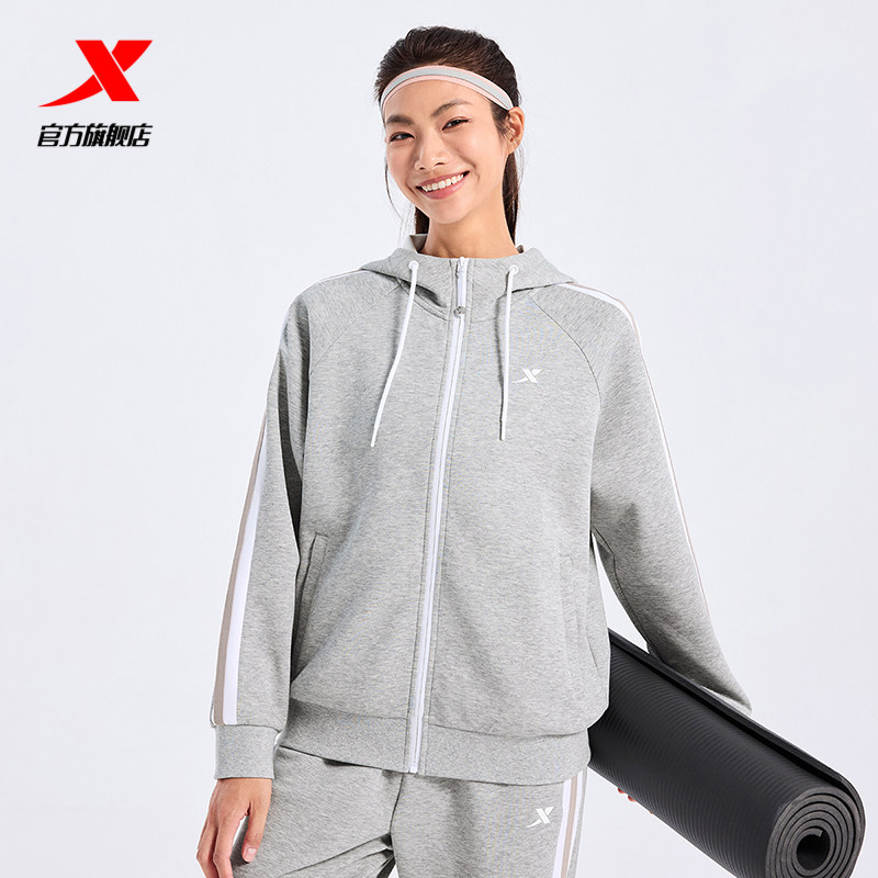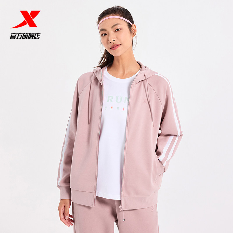 特步针织卫衣外套女士秋冬新款官方运动女装连帽上衣休闲立领夹克