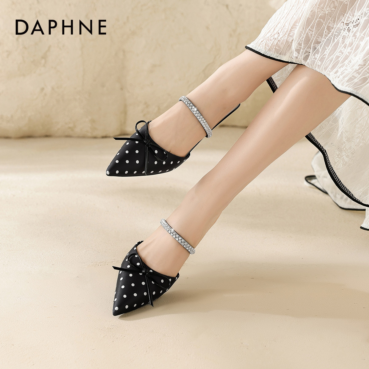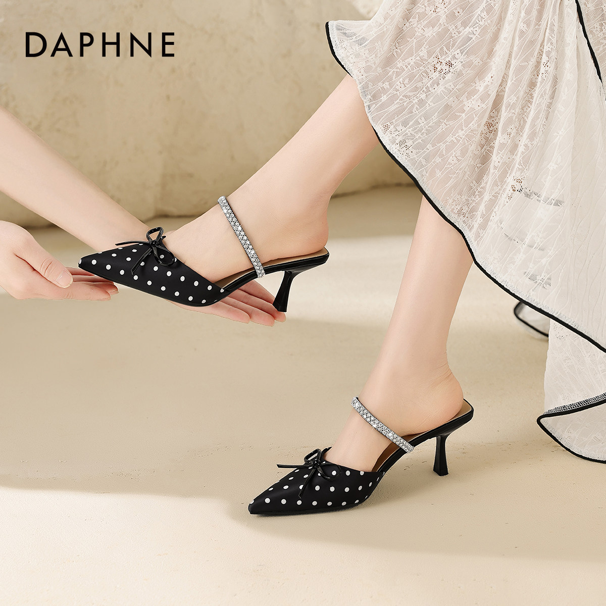 达芙妮波点包头拖鞋女2026新款夏季凉鞋水钻细跟高跟鞋尖头凉拖鞋