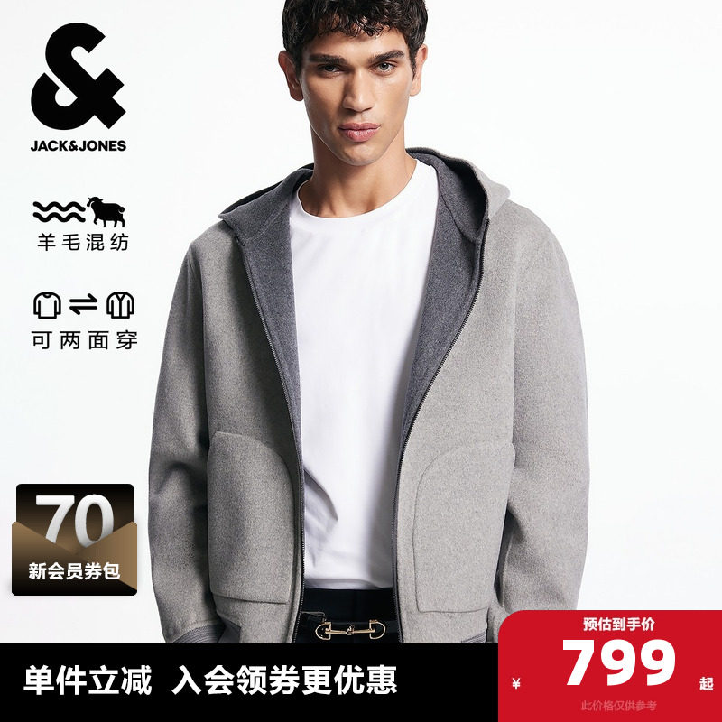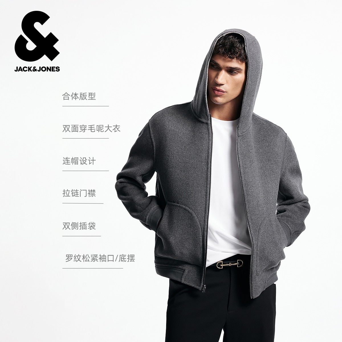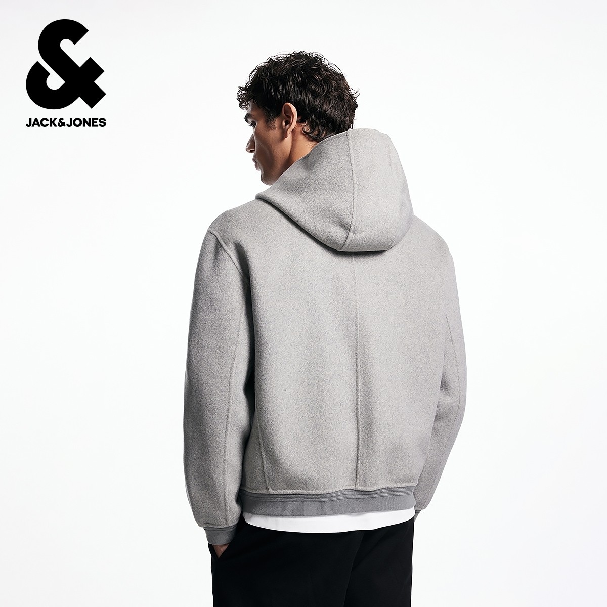 杰克琼斯奥特莱斯男装士秋季新款毛呢大衣长袖舒适插袋连帽上衣