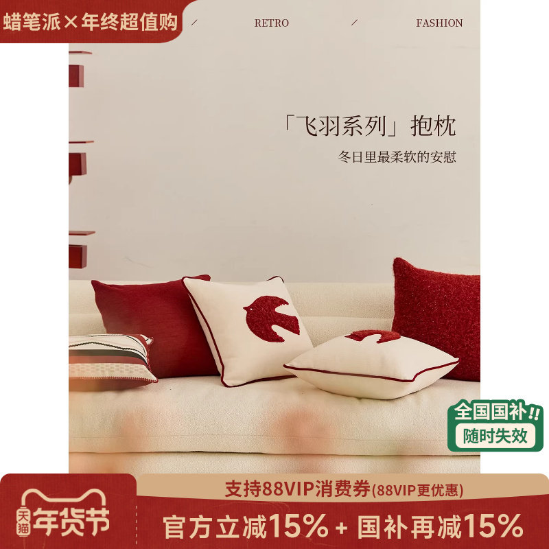 【国补再减15%】蜡笔派飞羽刺绣抱枕红色现代轻奢民族风沙发靠垫
