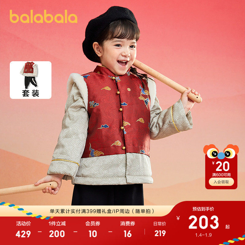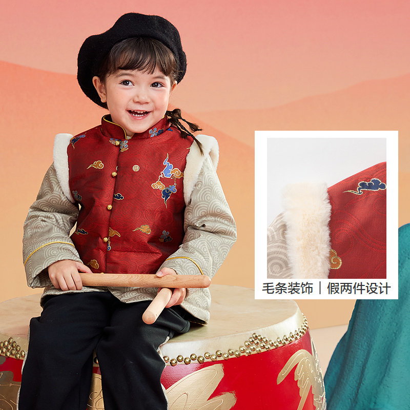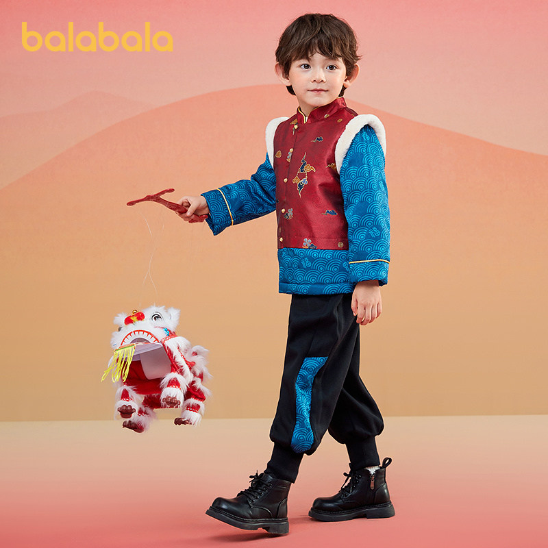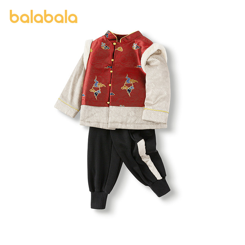 巴拉巴拉童装男童套装女童加绒冬装国风中式儿童假两件红色拜年服