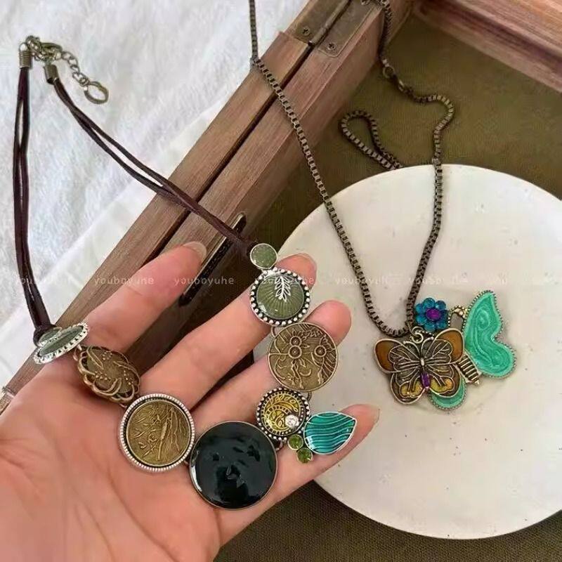 中古风双生绿色蝴蝶项链女款vintage波西米亚锁骨链古着独特配饰