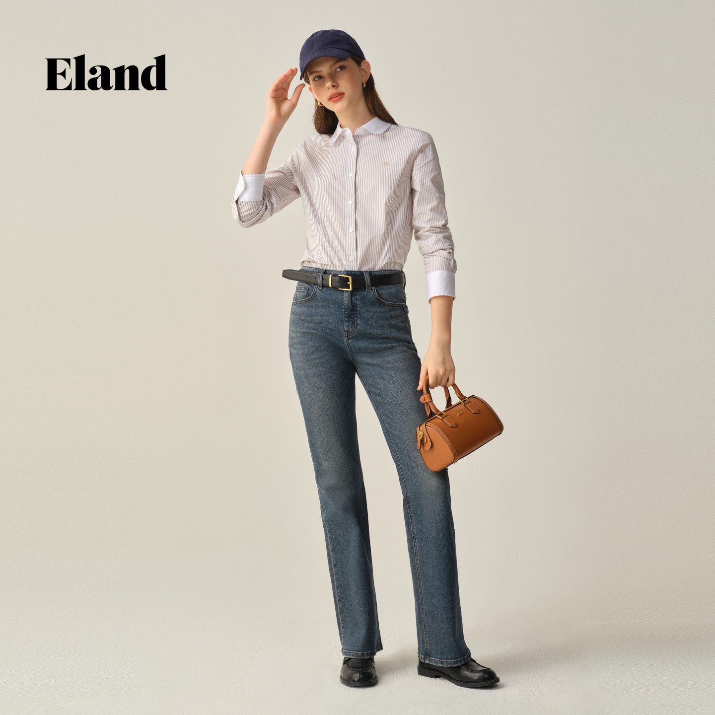 Eland衣恋衬衫女棉质撞色翻领单排扣长袖上衣2025秋季新