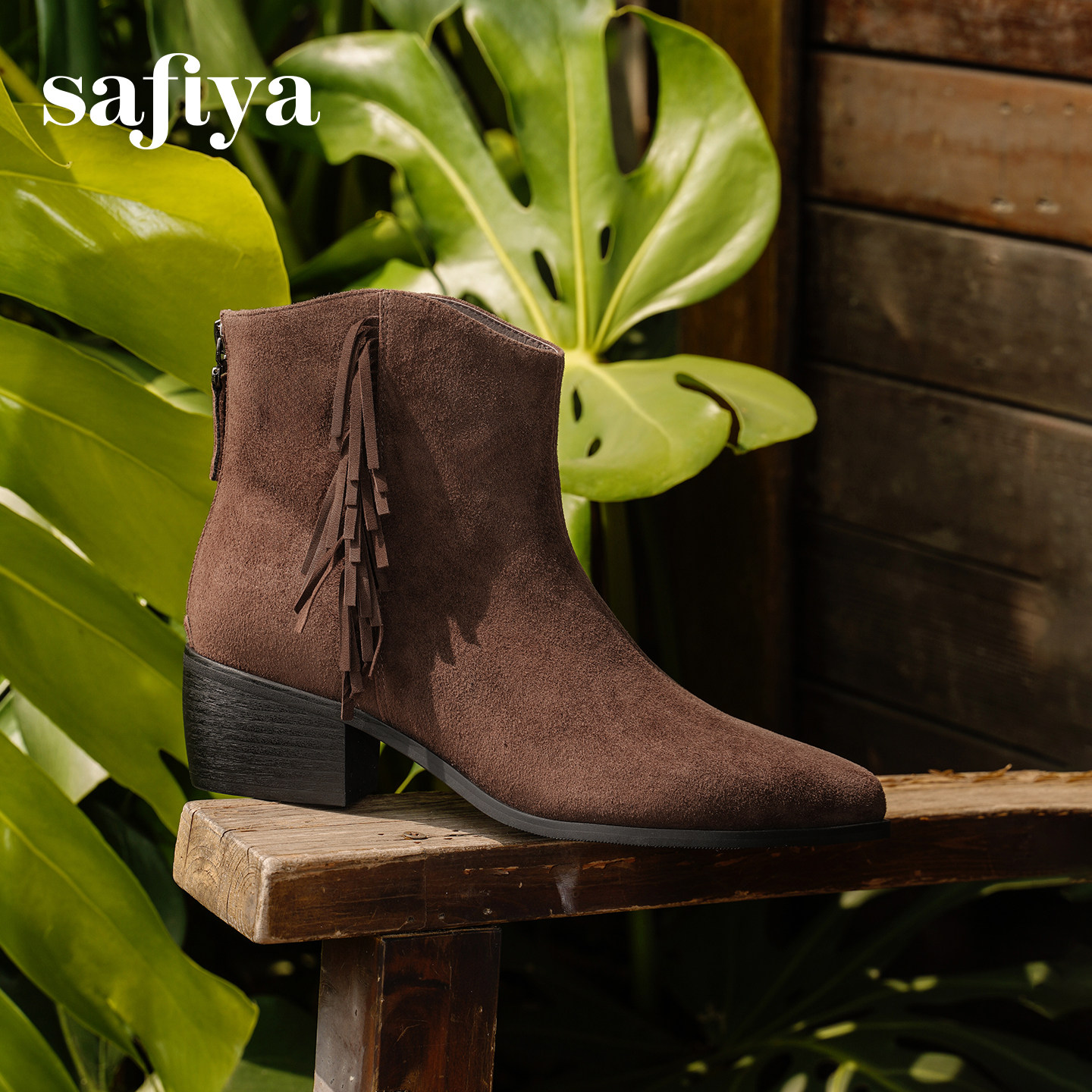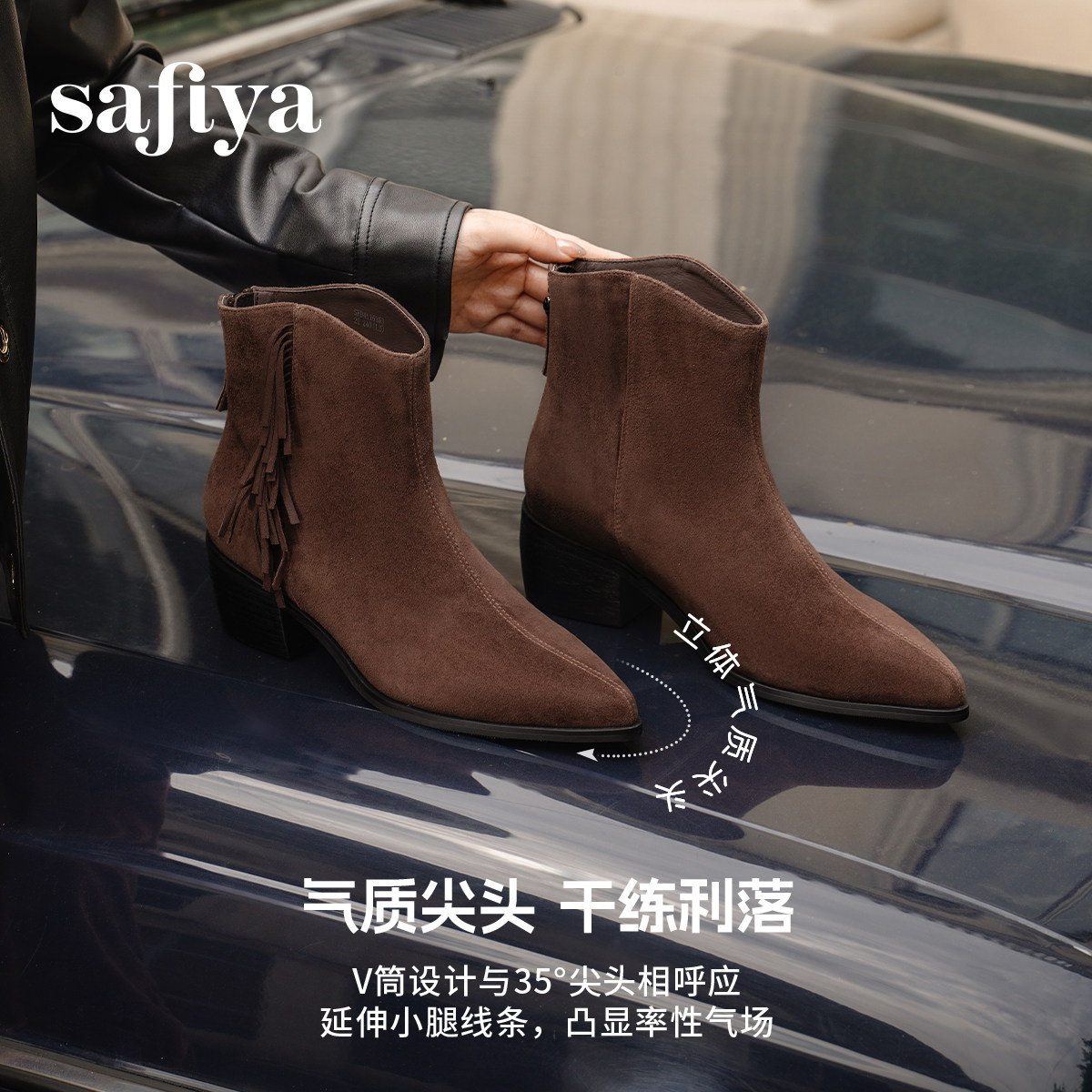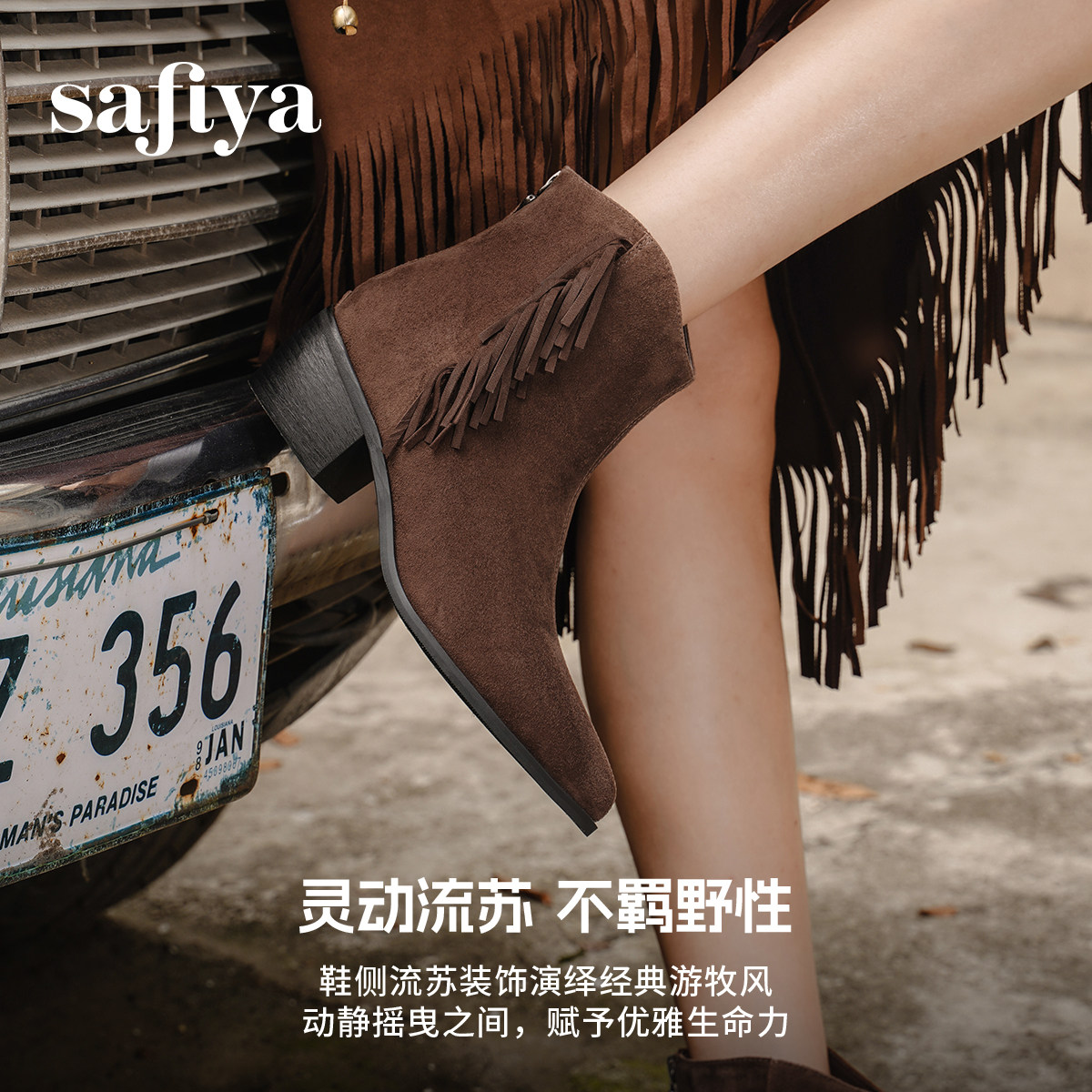 Safiya/索菲娅2025冬季新品流苏废土风羊皮尖头复古西部牛仔靴