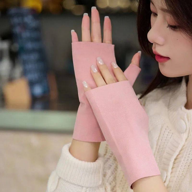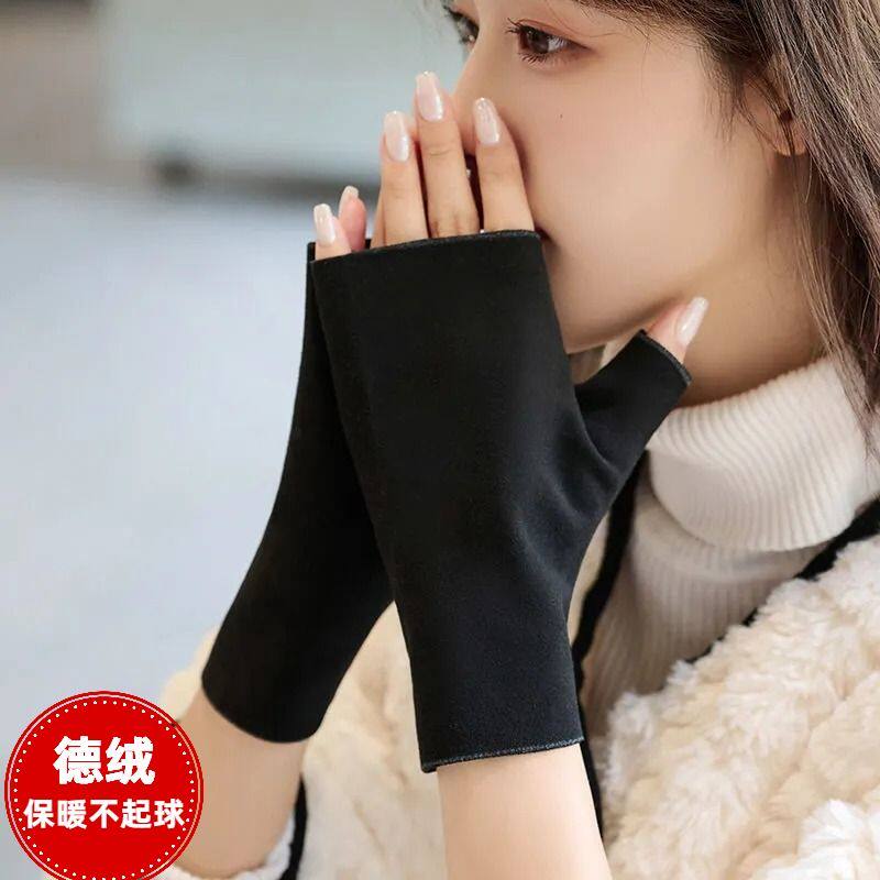 手套女士冬季自发热双面德绒半指薄款加绒露指保暖手套男打字短款