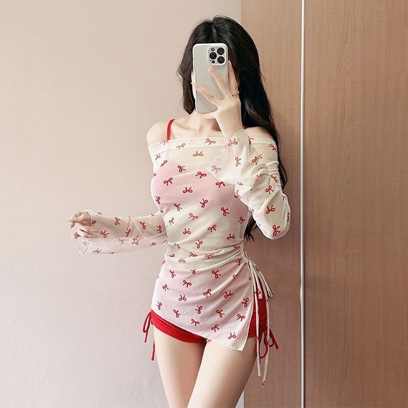 新款泳衣女性感纯欲辣妹气质长袖挂脖罩衫温泉比基尼分体绑带聚拢