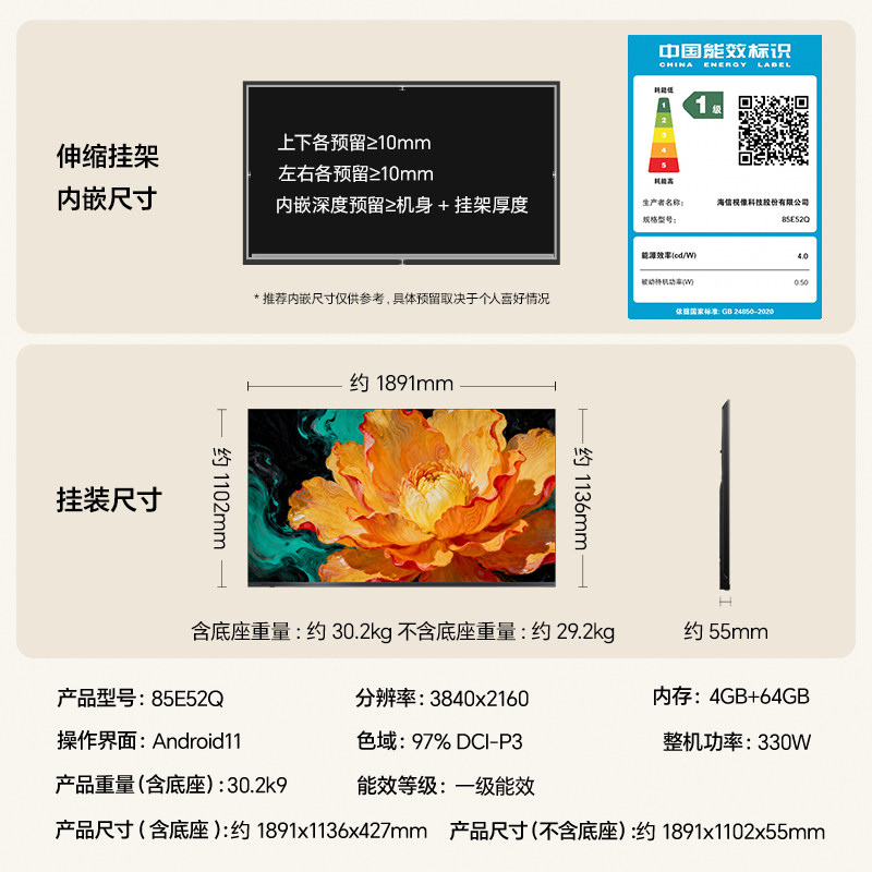 海信电视大薄荷E52Q 85吋MiniLED超薄贴墙低反屏世界杯定制电视机