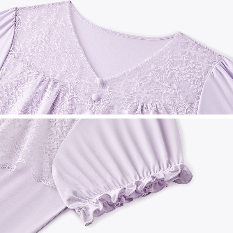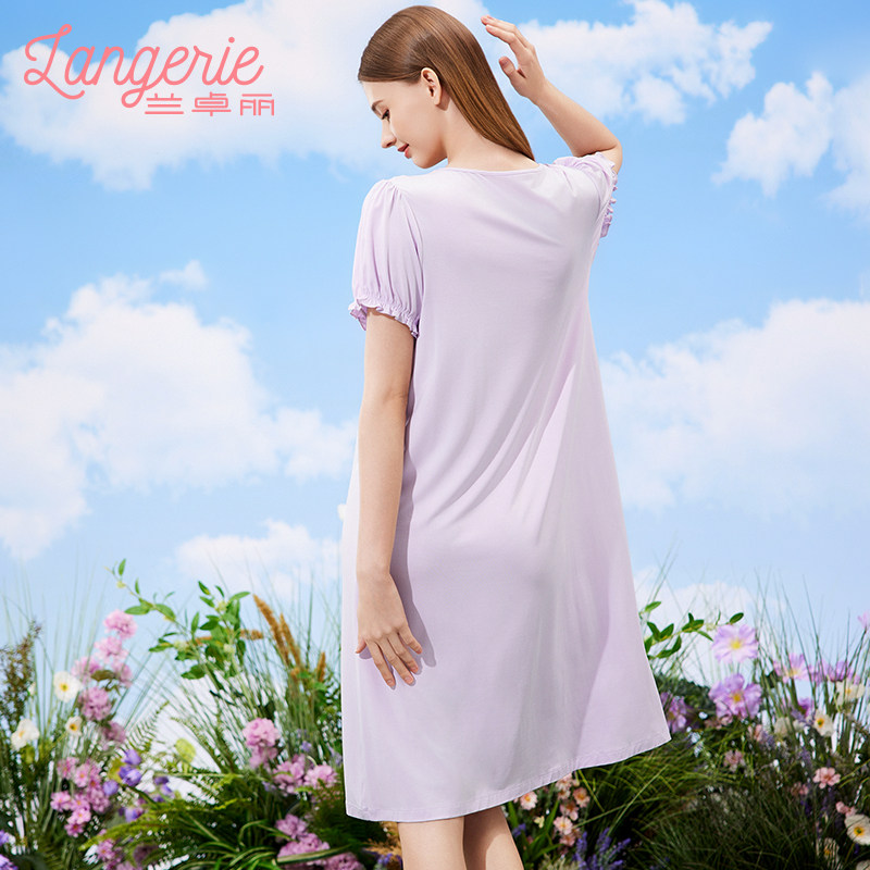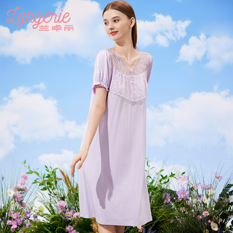 兰卓丽睡裙女短袖睡衣舒适家居服蕾丝V领遮点防走光可外穿夏季款