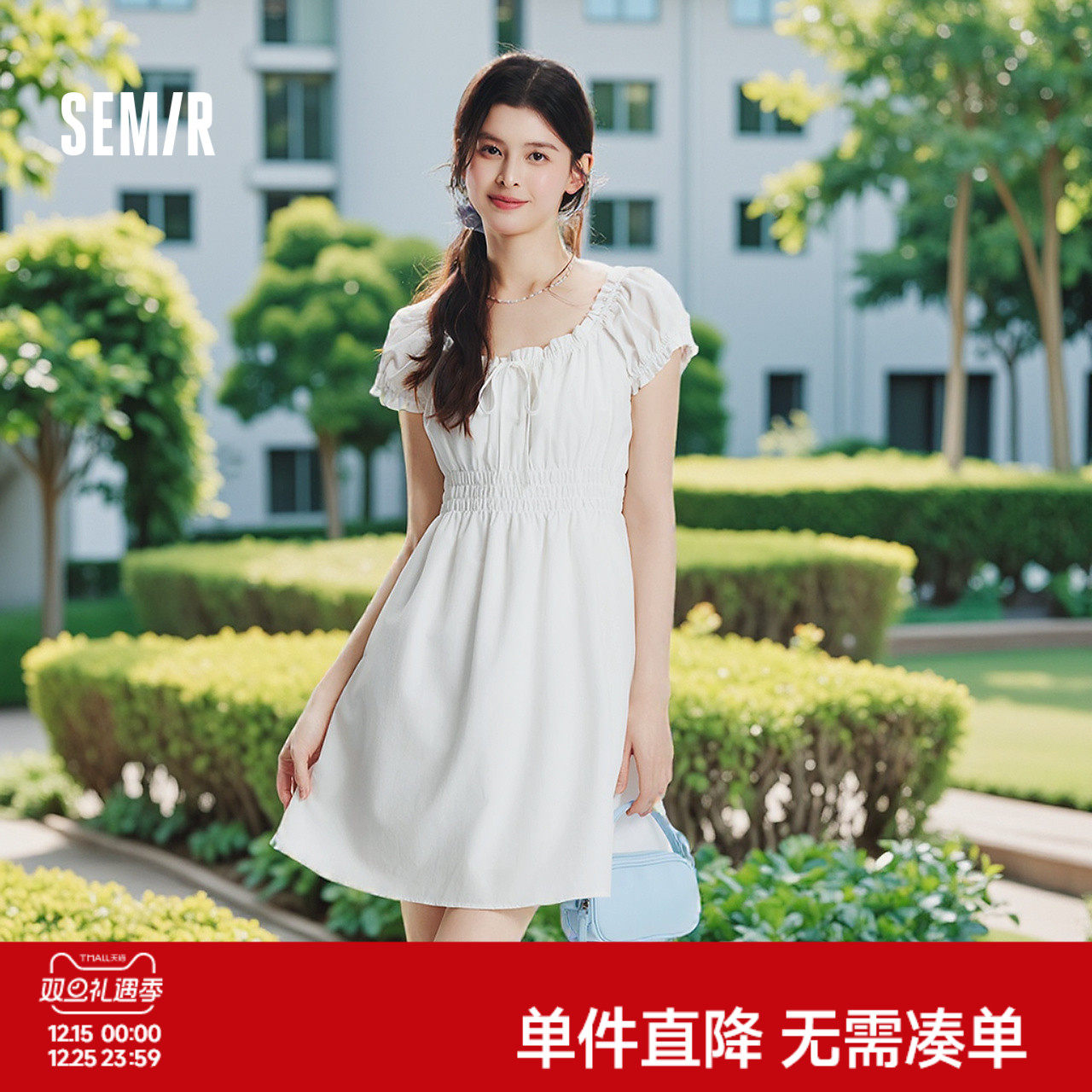 森马连衣裙女收腰蝴蝶结少女感2025新款夏俏皮木耳边方领短裙气质