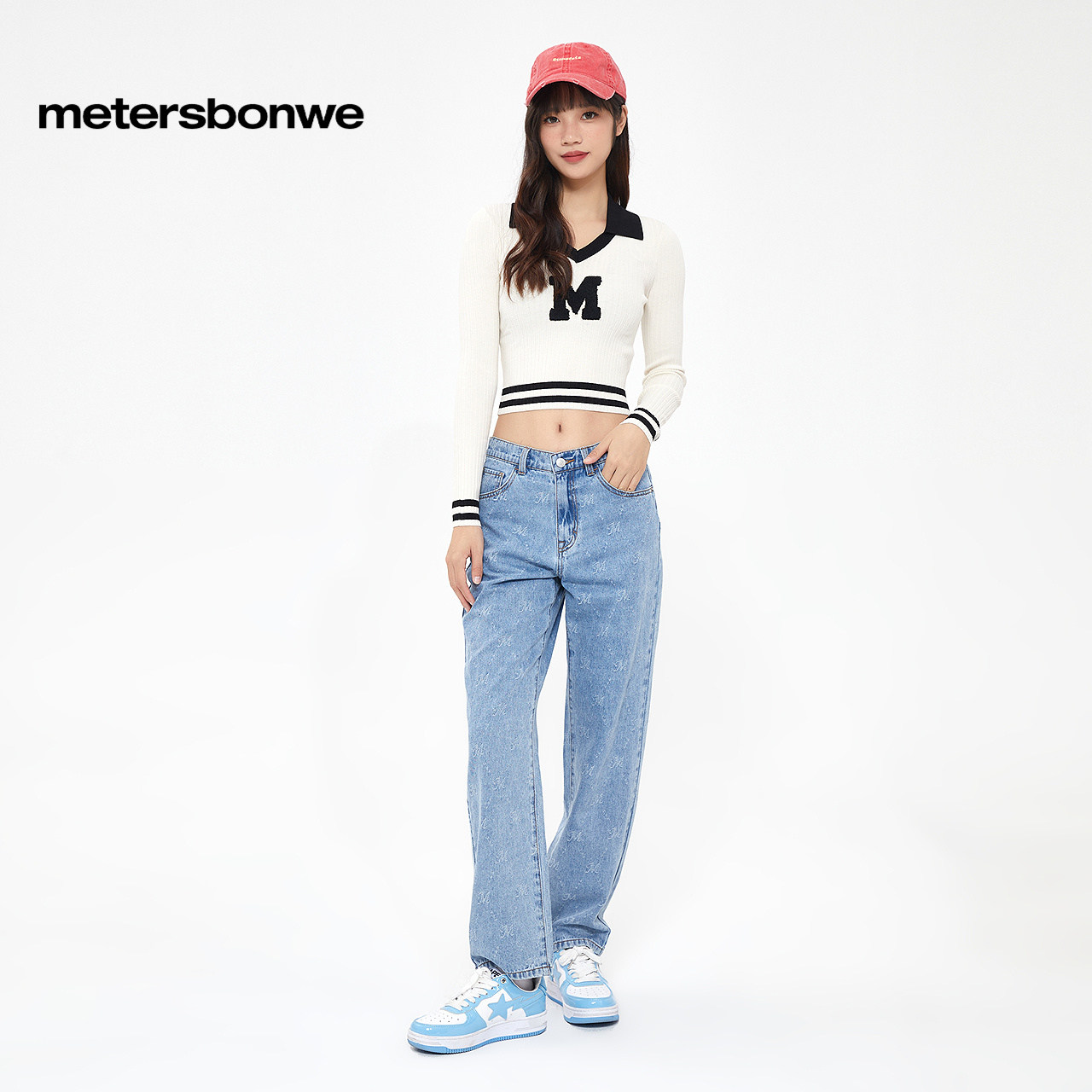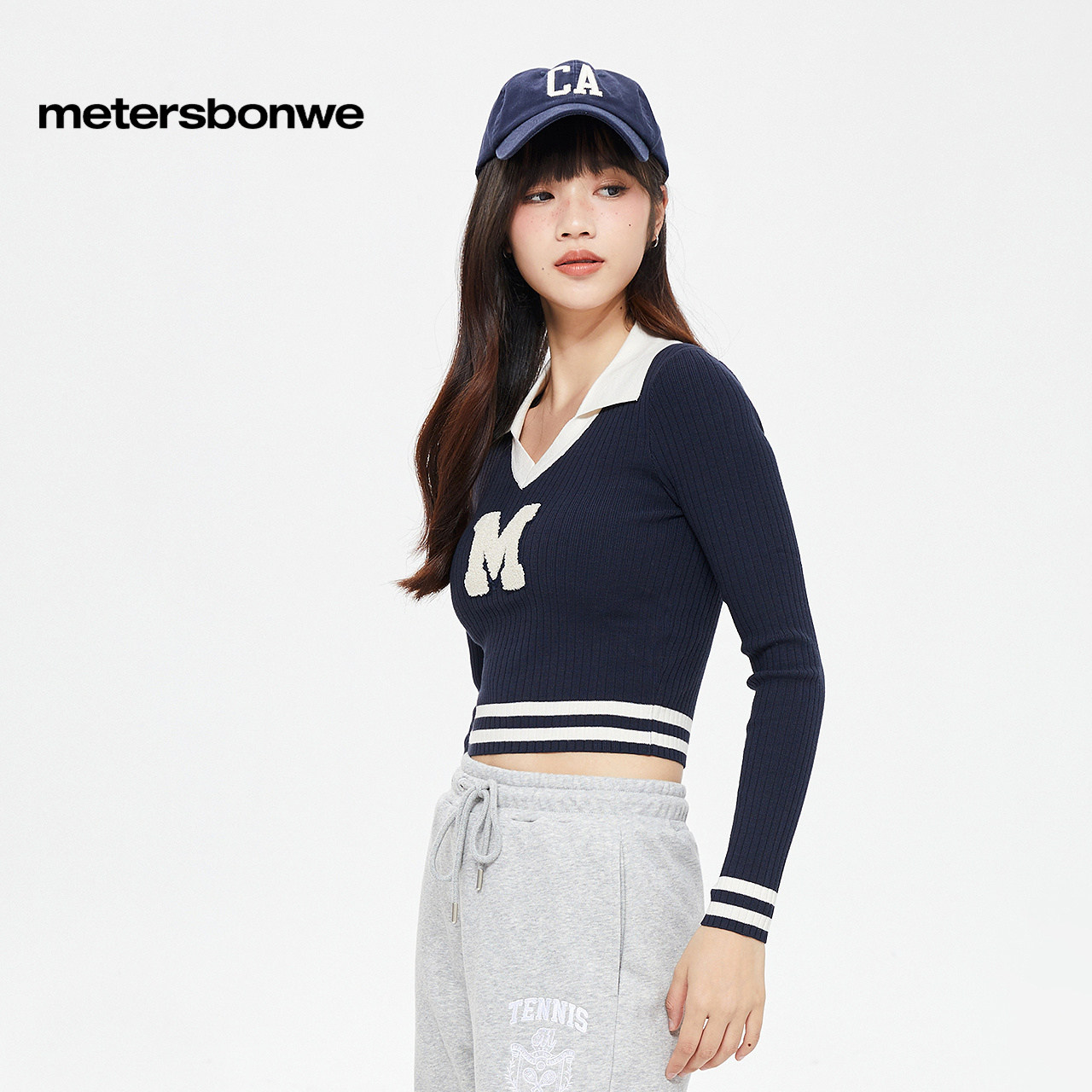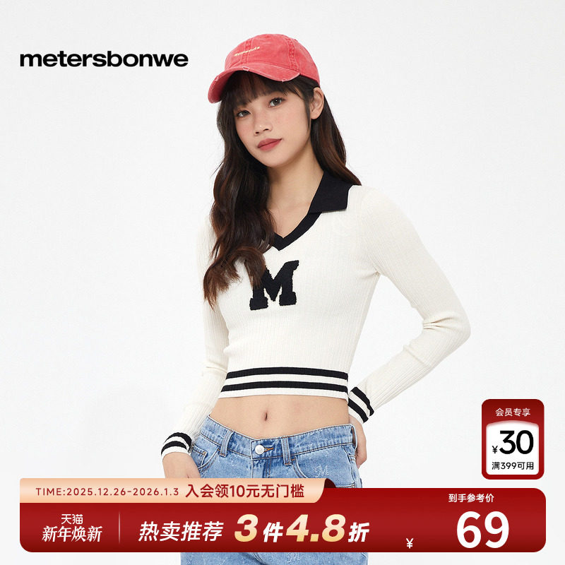 美特斯邦威毛衣女春季新款百搭字母V领套头时尚长袖短款内搭上衣