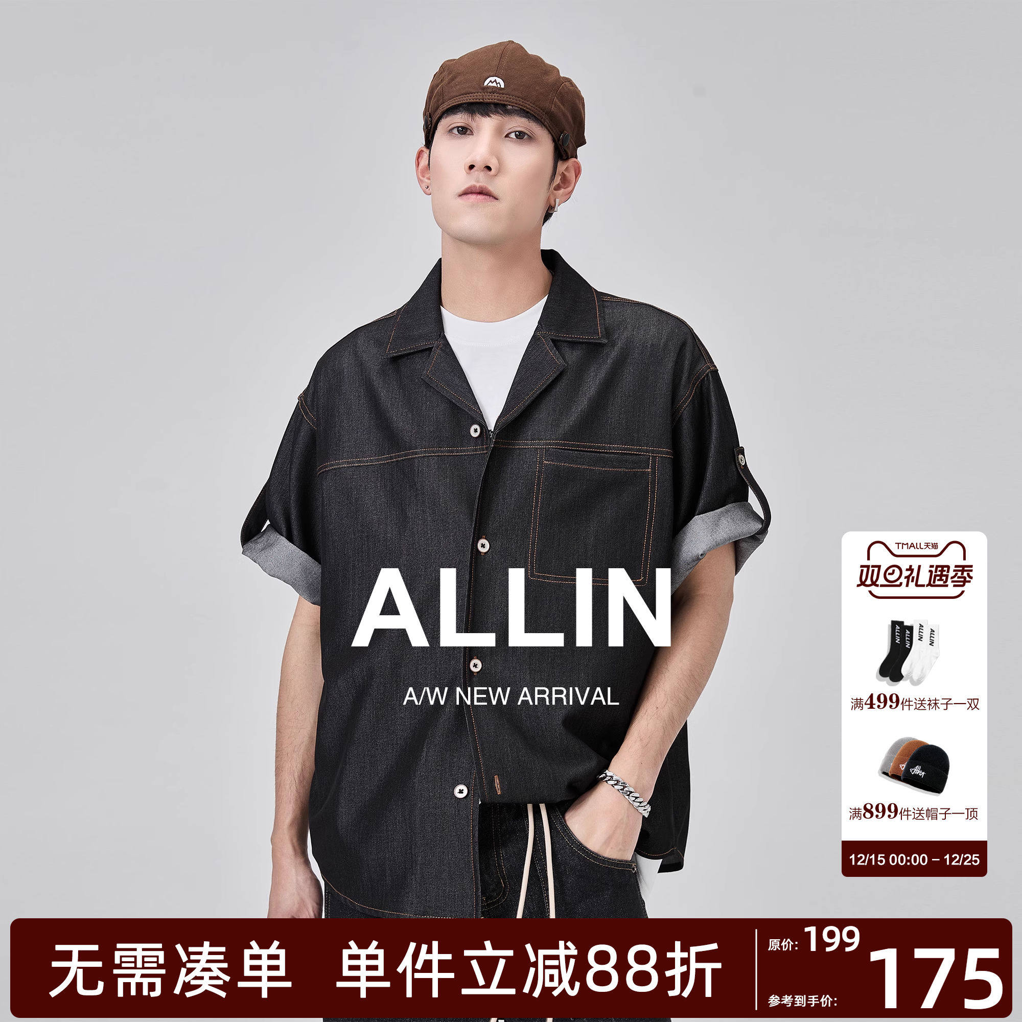 ALLIN 黑色短袖衬衫男夏季复古水洗翻领牛仔外套宽松百搭情侣上衣