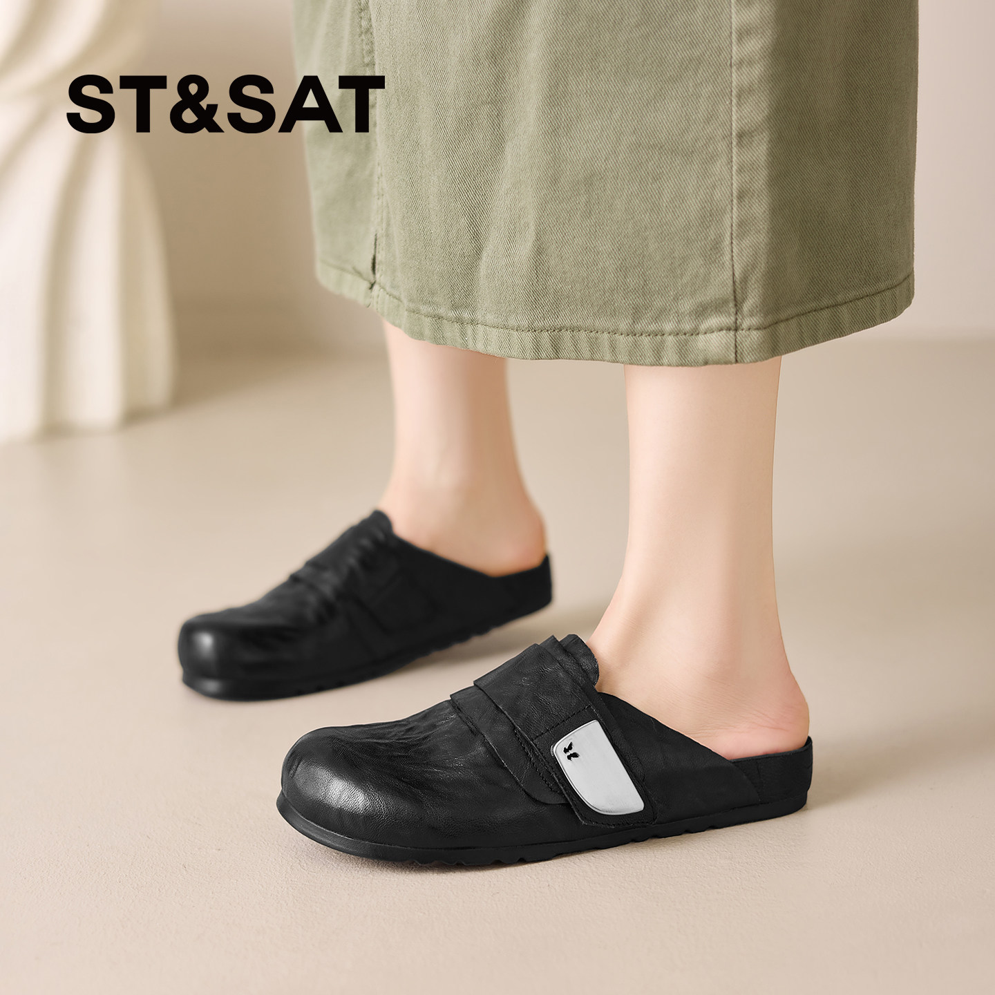 真皮包头穆勒鞋女半拖2025新款一脚蹬软面懒人平底拖鞋女夏外穿