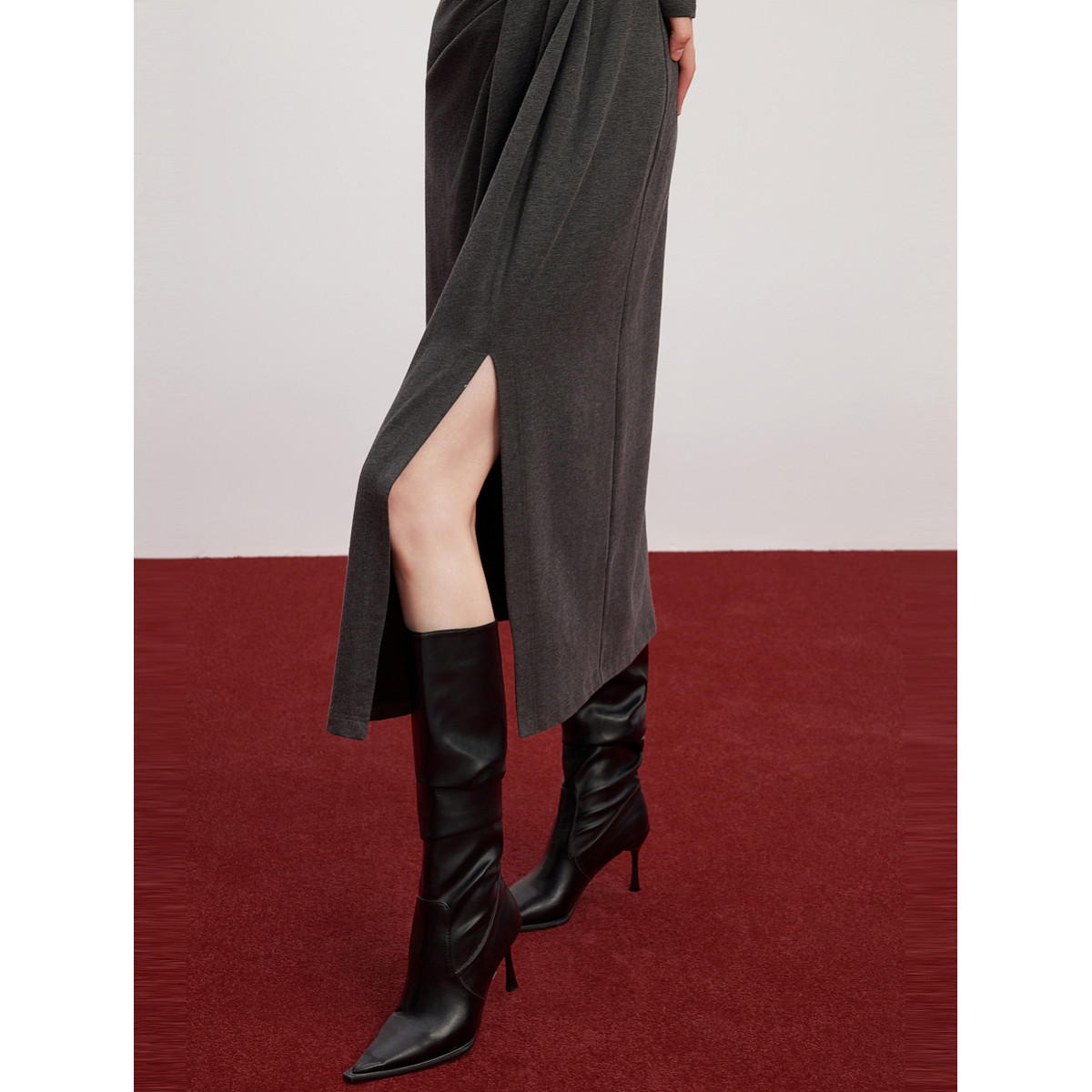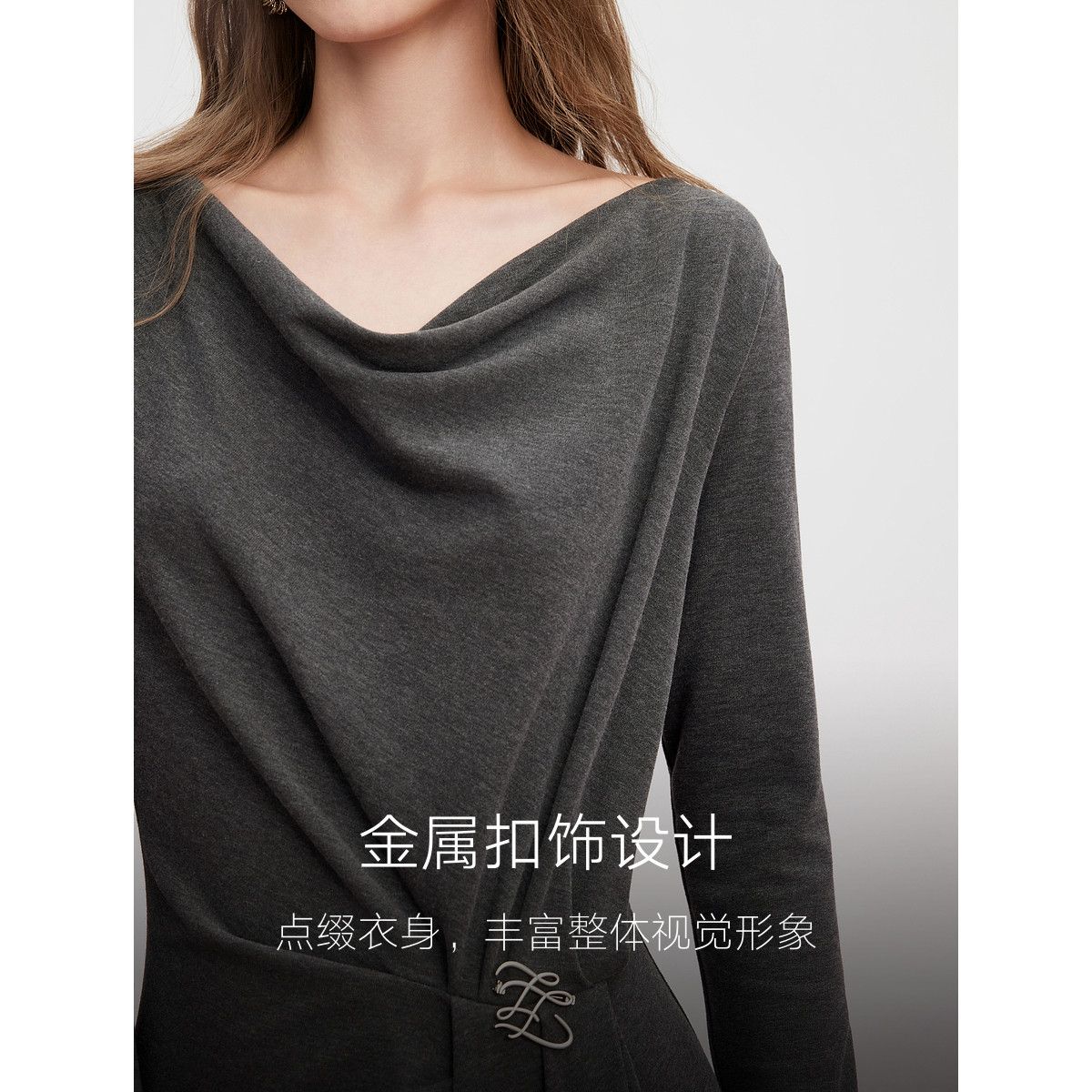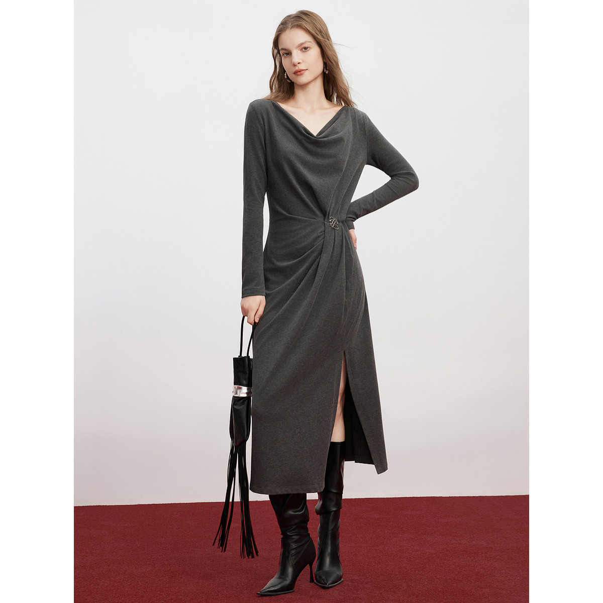 ELLE法式荡领优雅长袖连衣裙女2025冬季新款收腰气质垂感长裙子