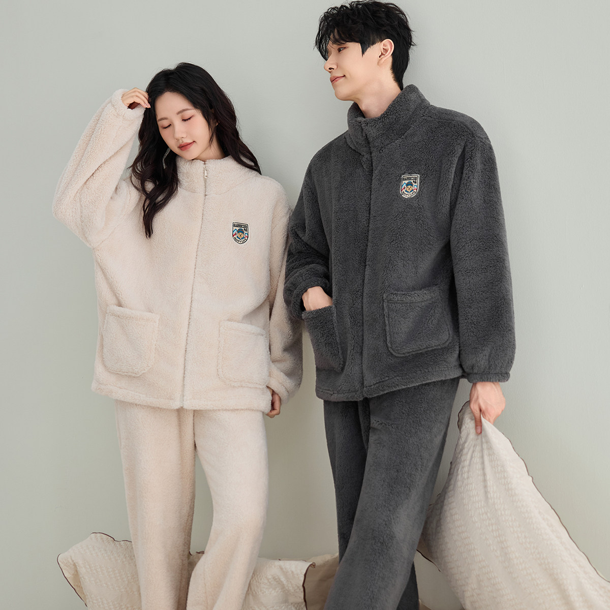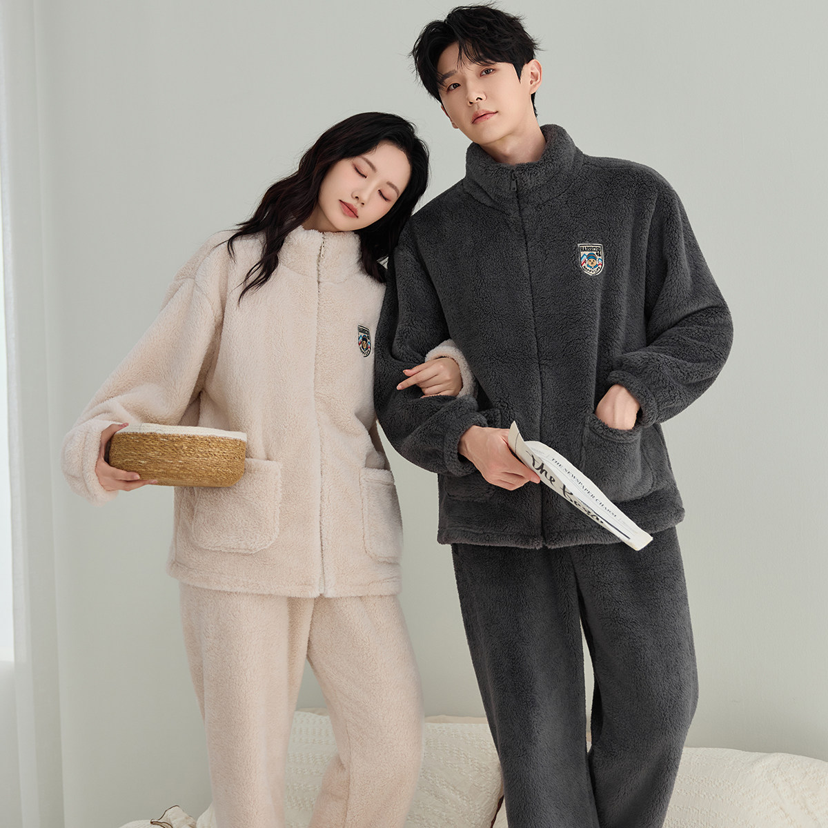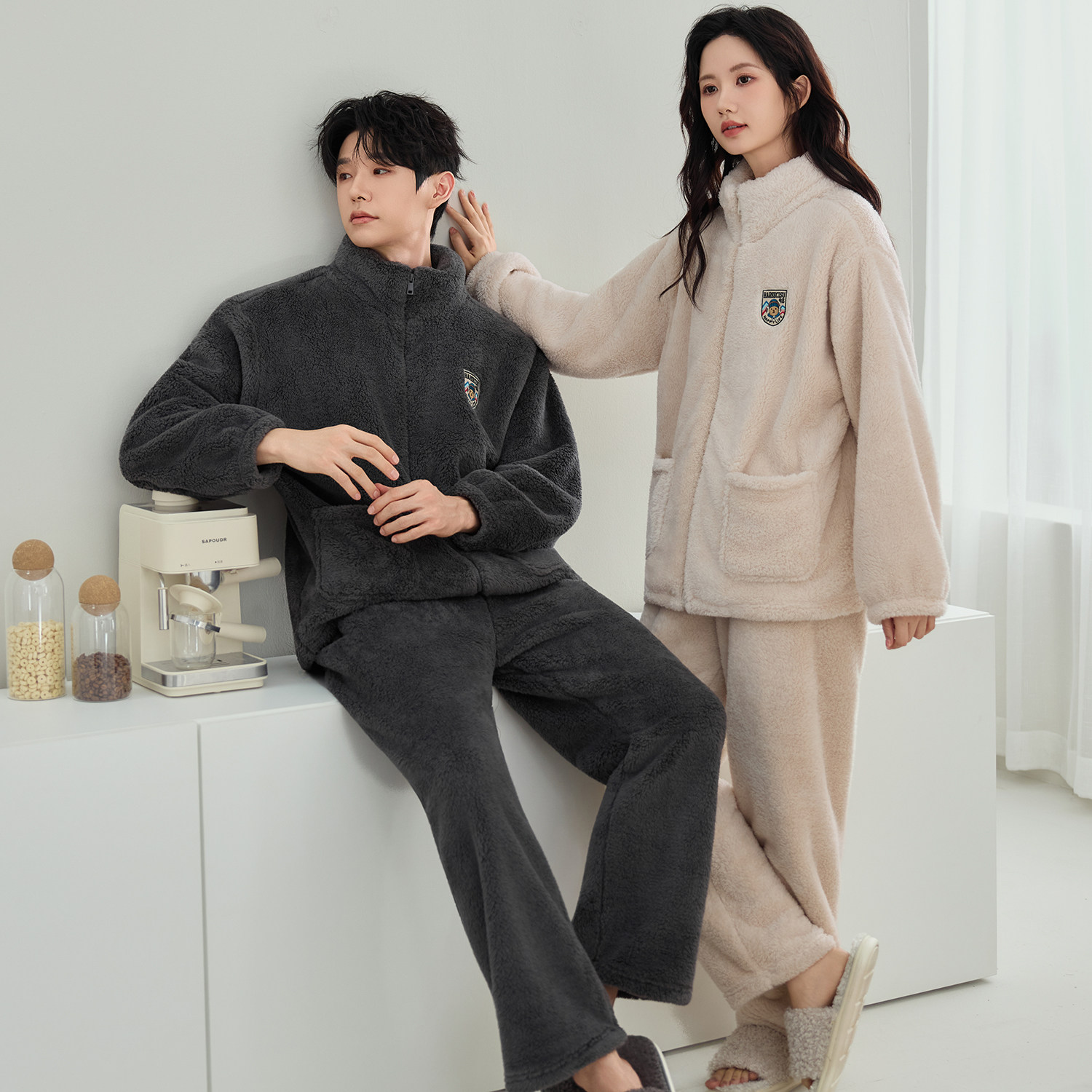 睡衣女秋冬加绒加厚珊瑚绒可外穿大码宽松情侣睡衣男士家居服套装