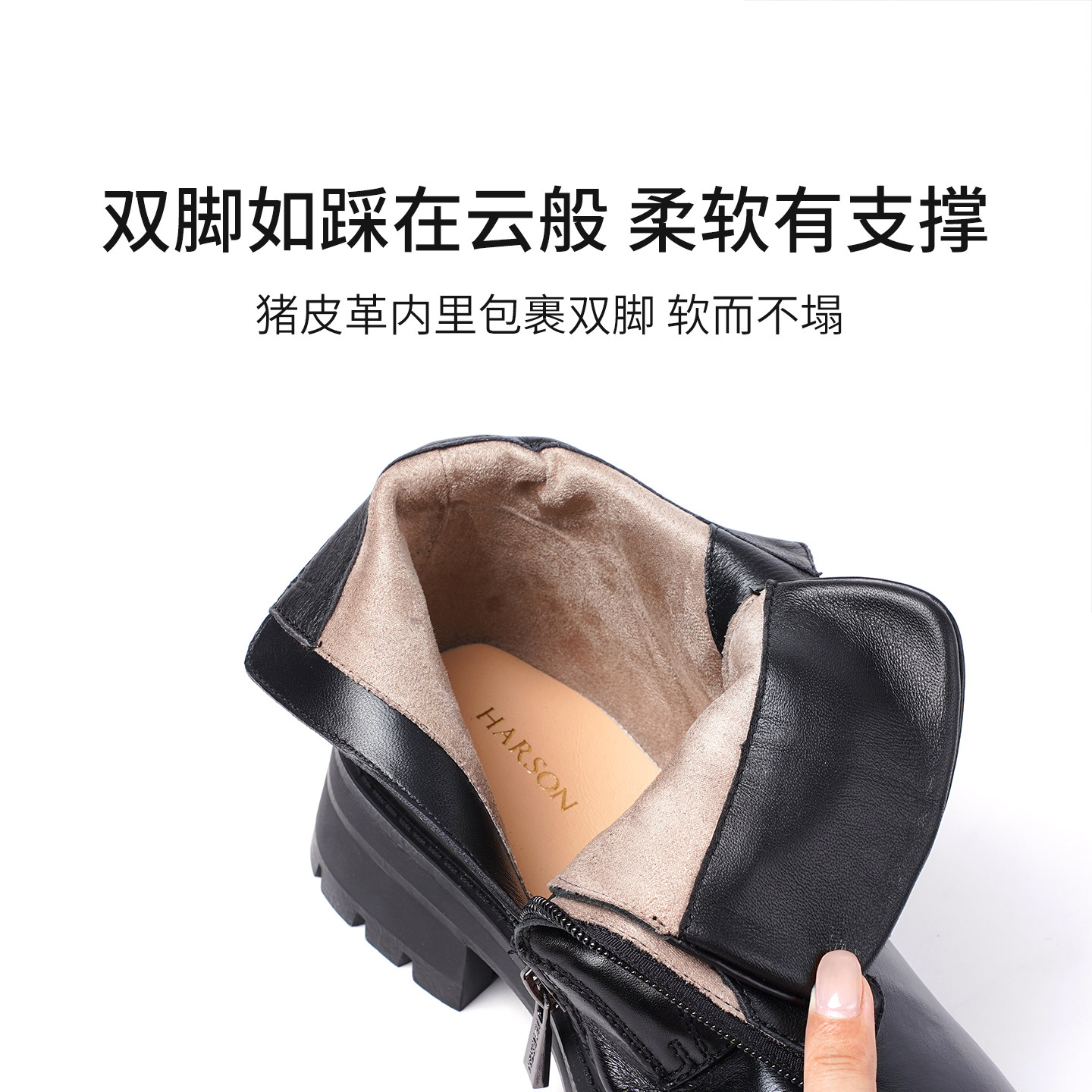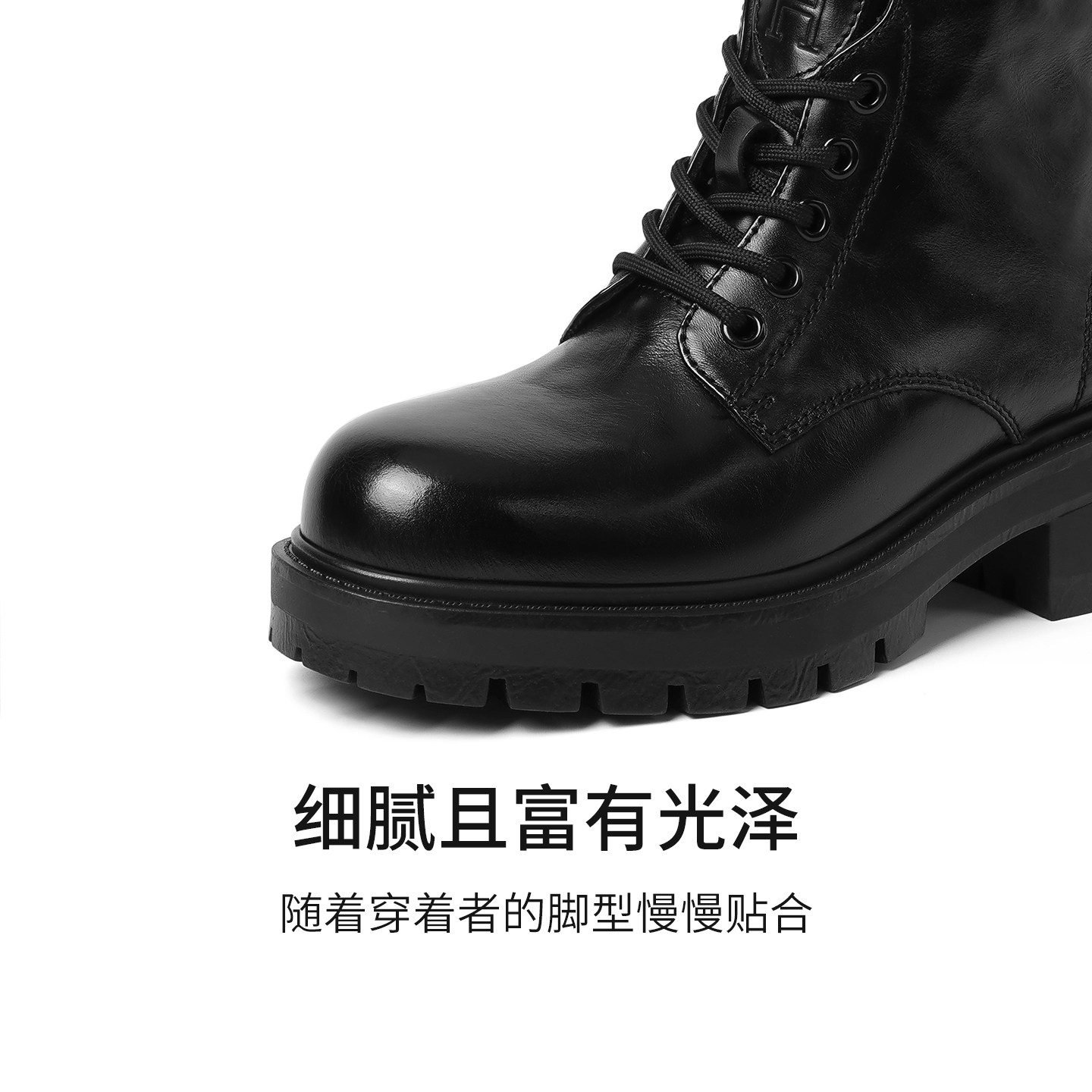 哈森圆头厚底真皮系带马丁靴黑色休闲女短靴2025冬新款HA253403
