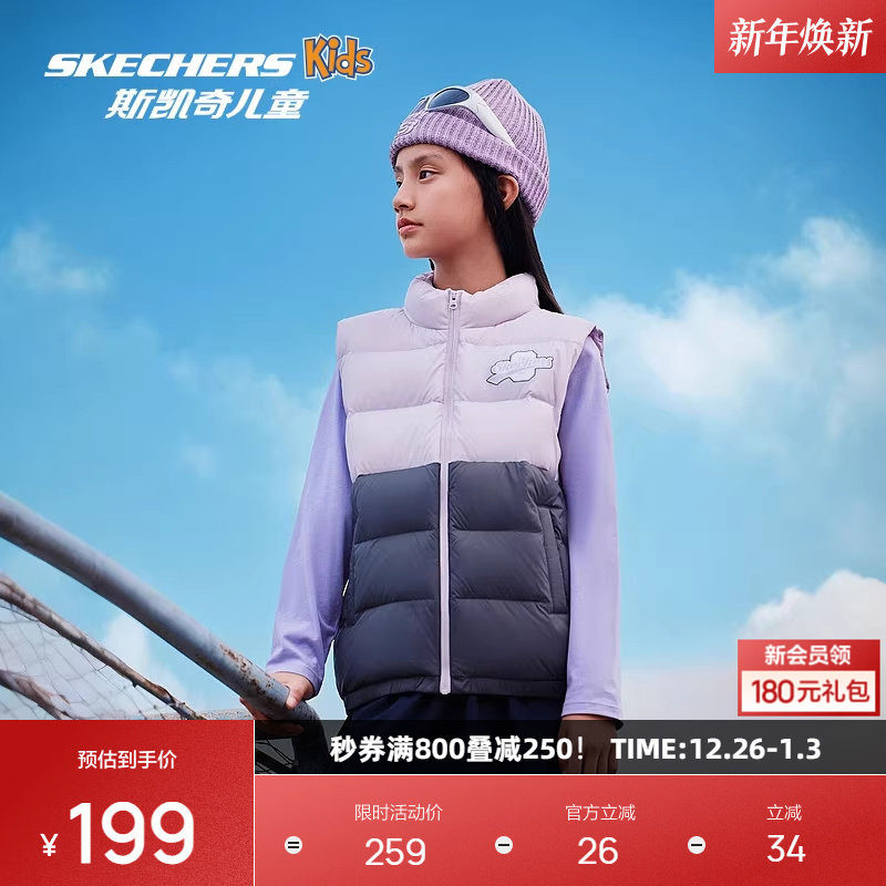 斯凯奇秋冬季男女中大童梭织轻便羽绒服背心儿童保暖外套休闲时尚