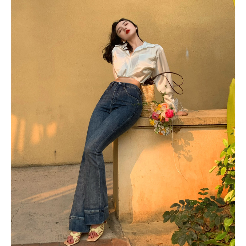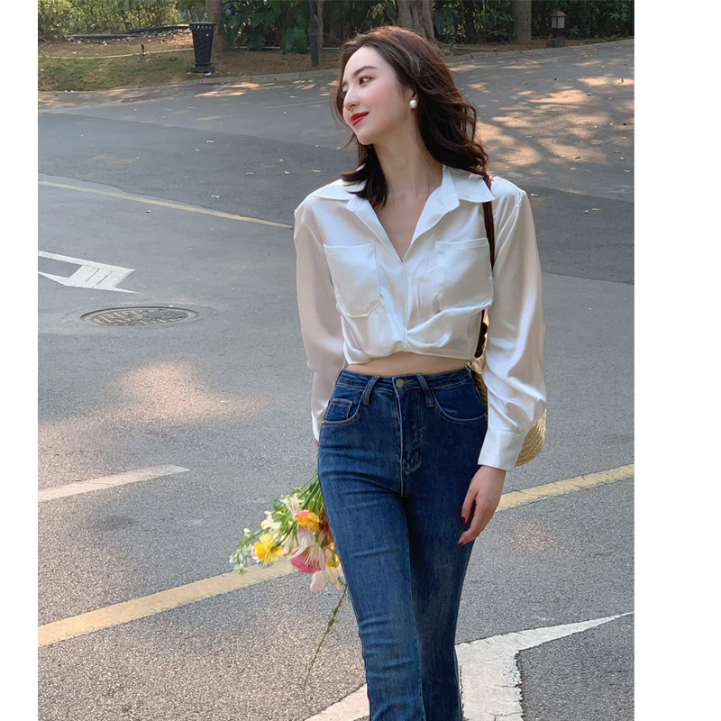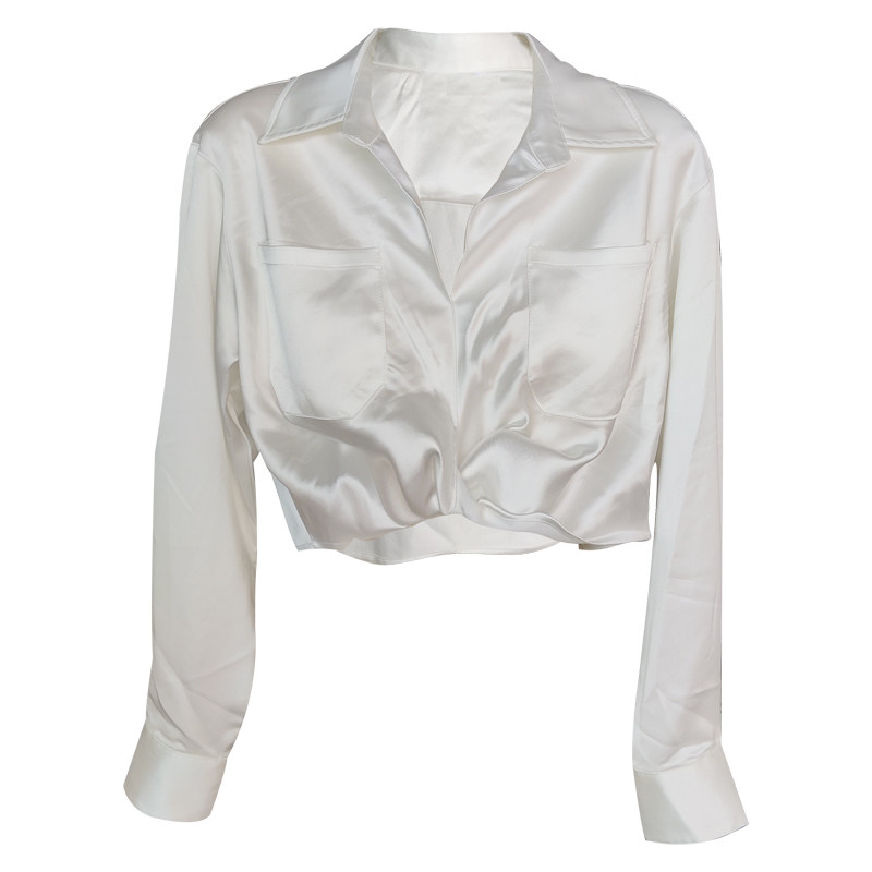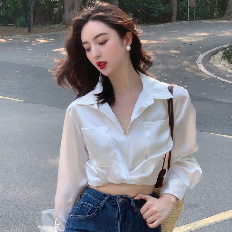 juju定制春秋季度假风长袖衬衫设计感缎面小衫白月光短款气质上衣