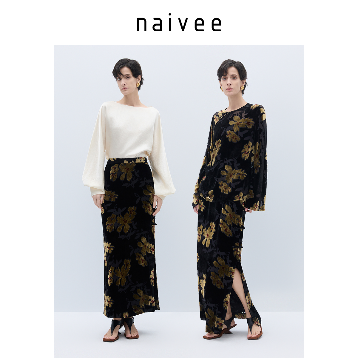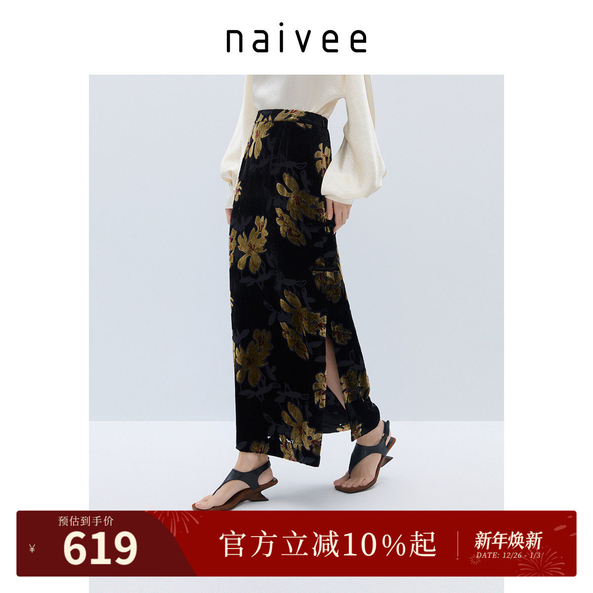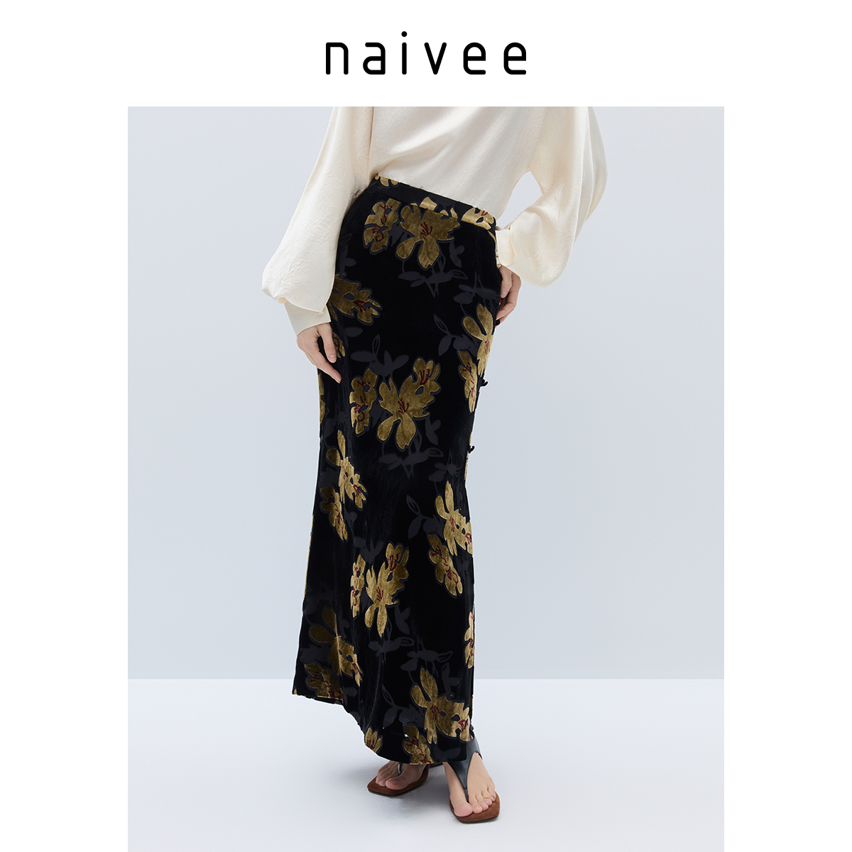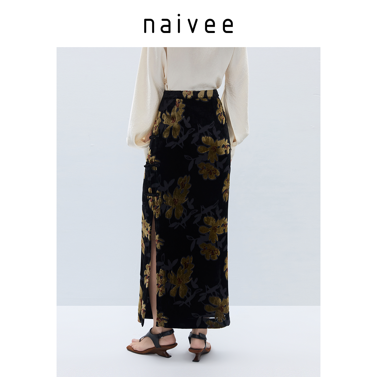 新中式真丝半裙』naivee纳薇25秋新中式老钱风丝绒烧花直筒裙长款