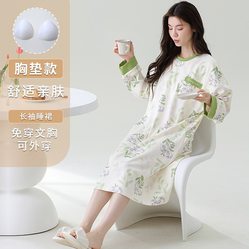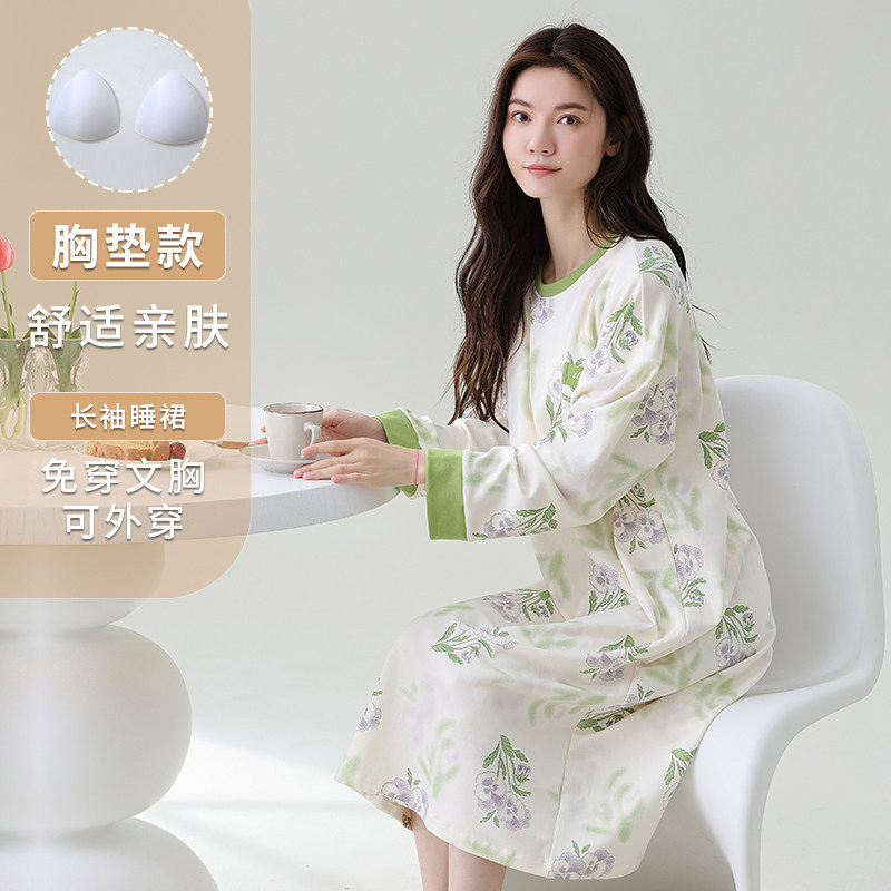 秋冬超火睡裙女士带胸垫一体式2025新款长袖大码宽松外穿睡衣裙