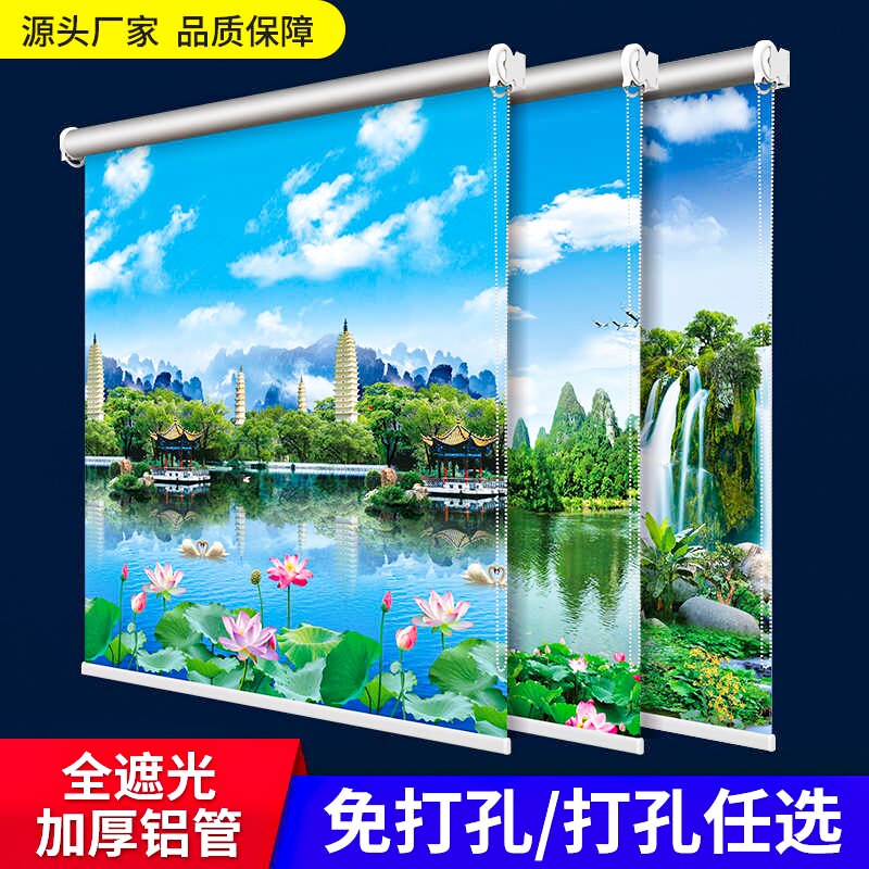 窗帘卷帘2026新款遮阳升降免打孔卧室厨房阳台山水画卷拉式遮光