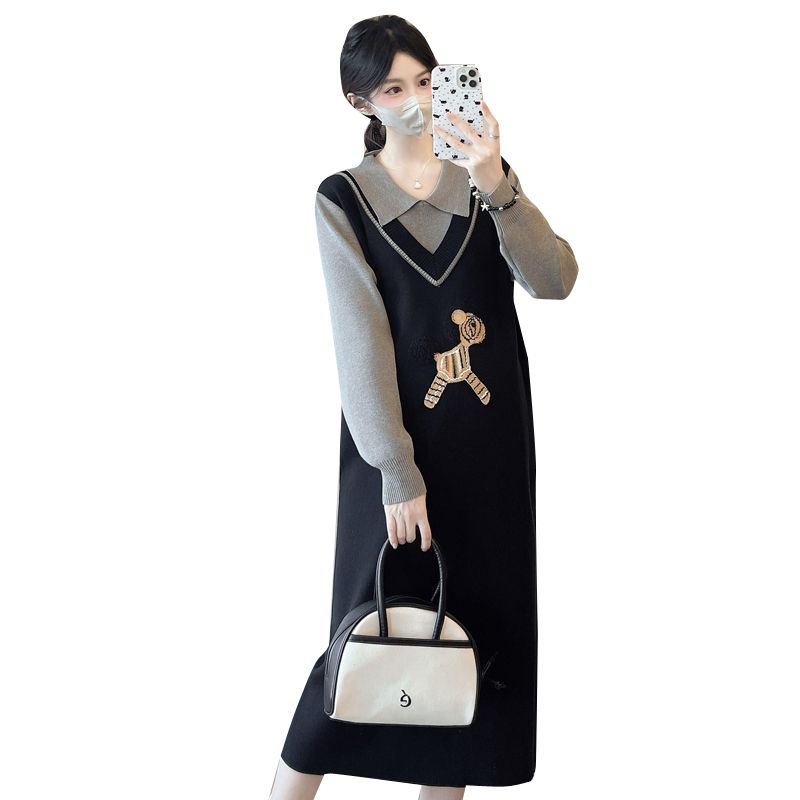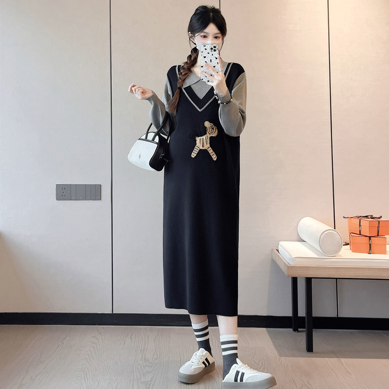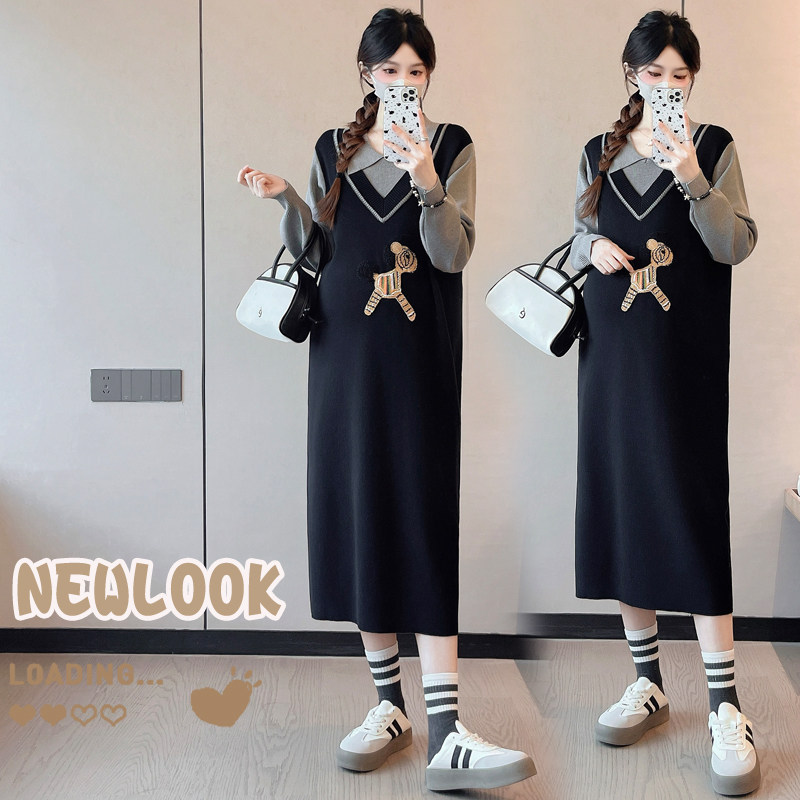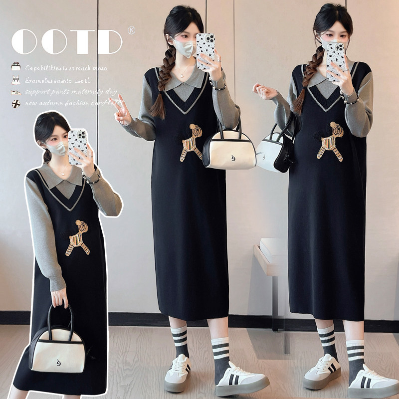 婧麒孕妇装假两件连衣裙2025年新款中长款针织显瘦大码毛衣裙子女