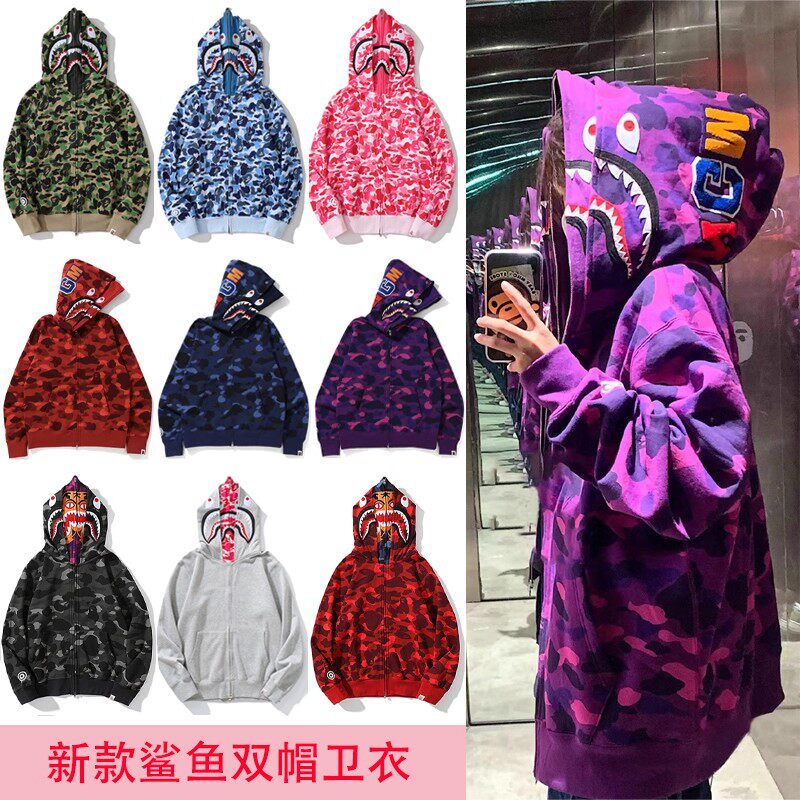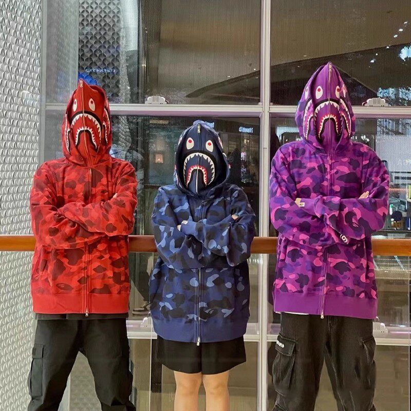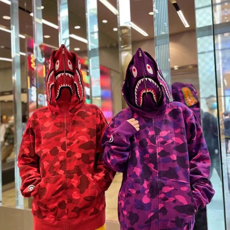 ape大童双帽刺绣新款潮鲨鱼服迷彩印花男女批发拉链到头外套红色
