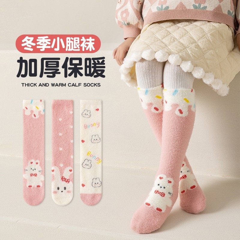 女童袜子水貂绒长筒秋冬季加绒儿童小腿袜粉色保暖加厚高筒中大童