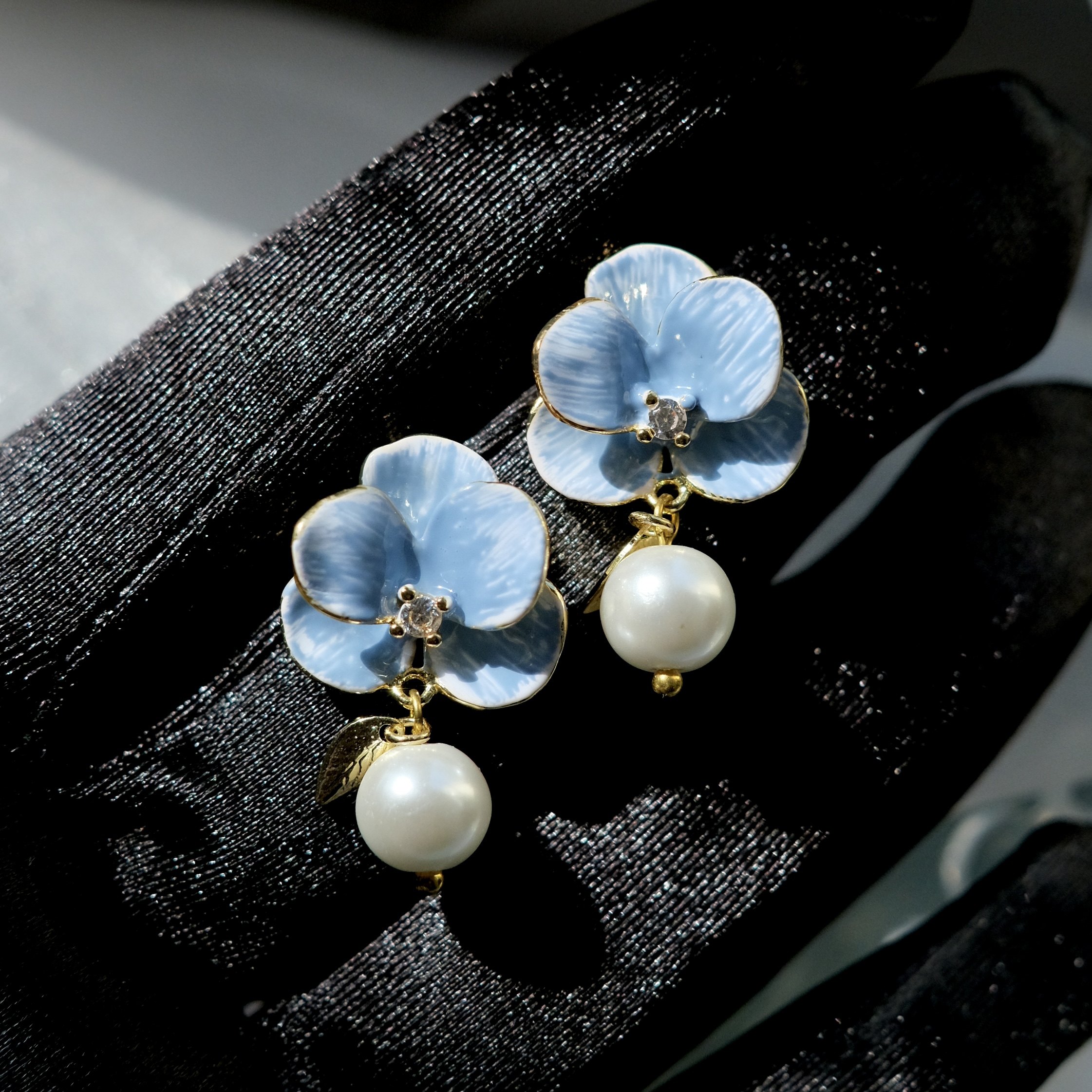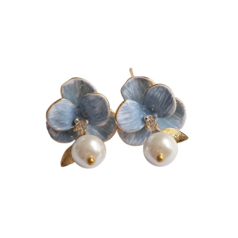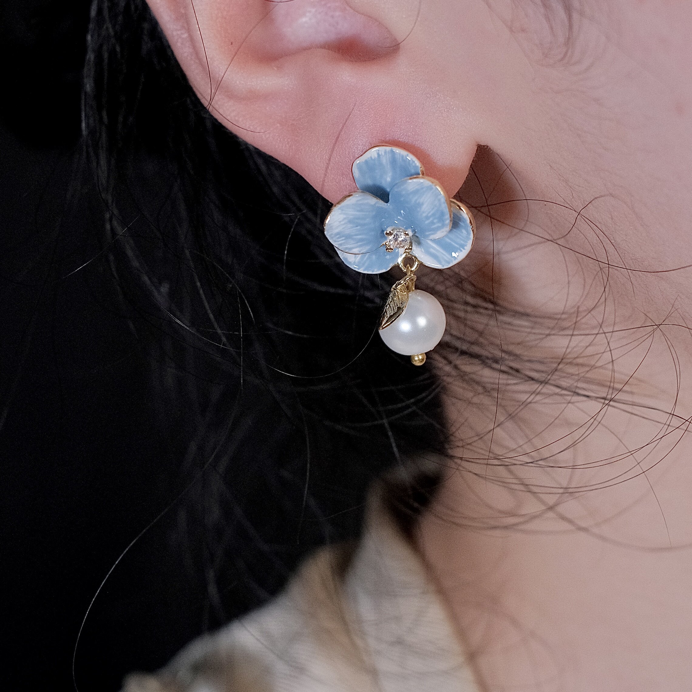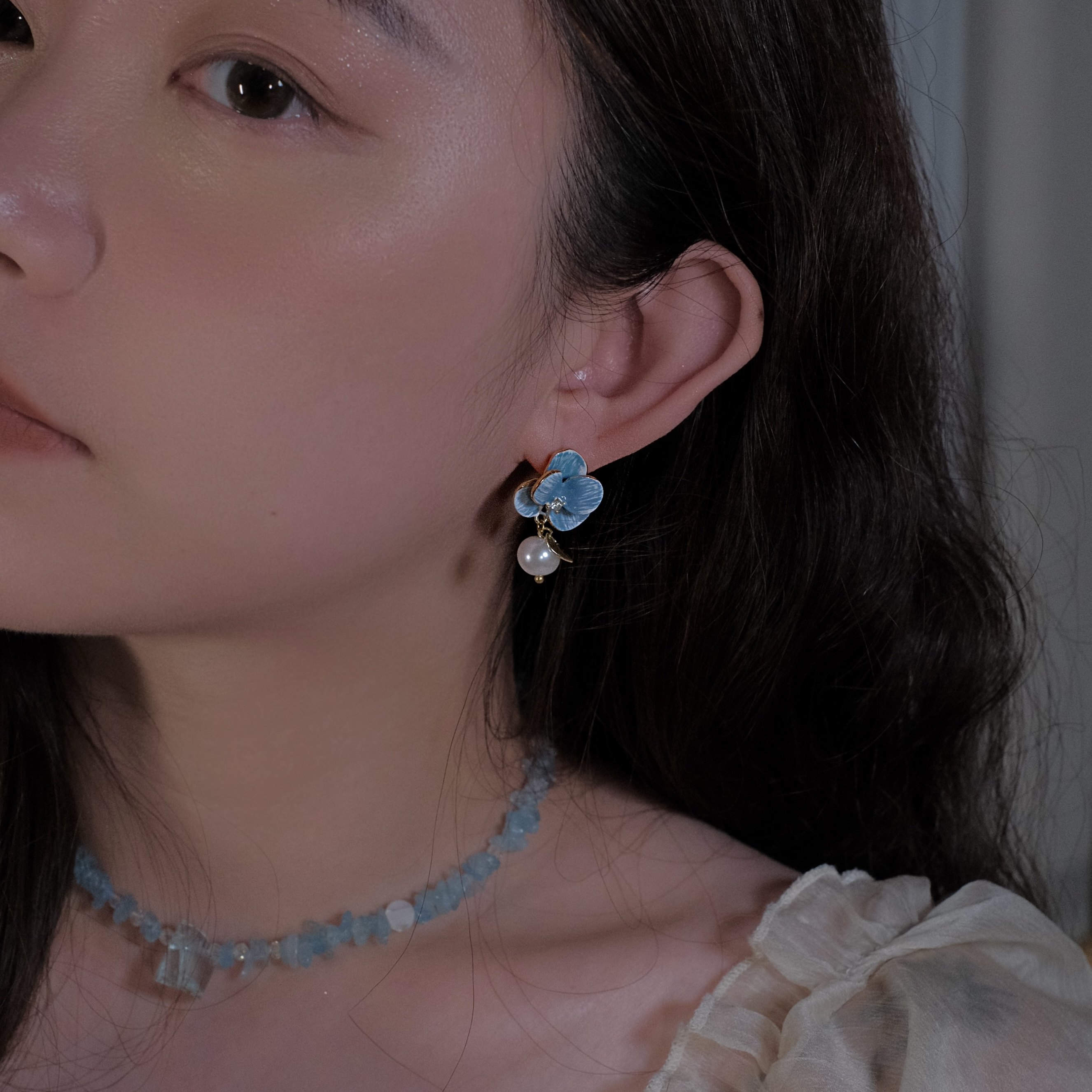 《云染蓝山》复古温柔蓝色花朵珍珠珐琅滴釉耳钉耳环耳夹无耳洞女