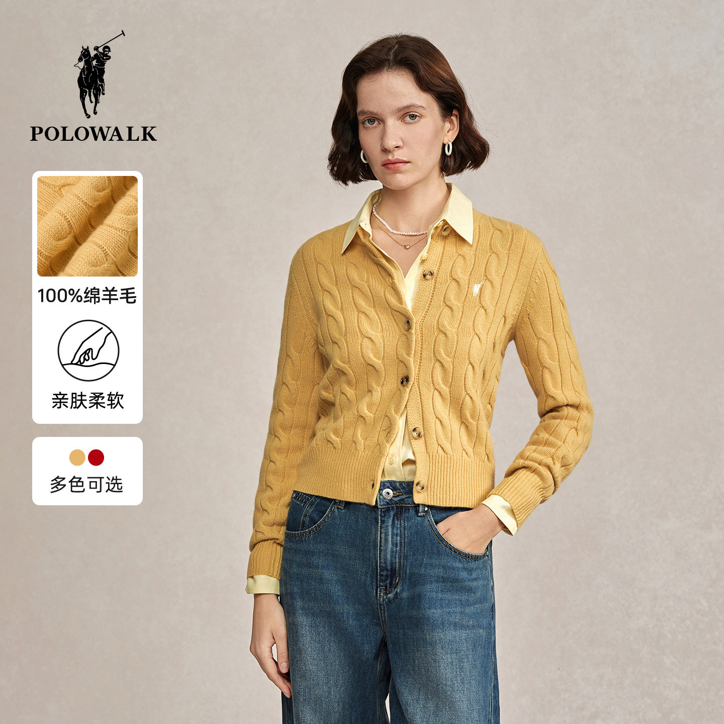 【100%绵羊毛】POLOWALK女式羊毛衫2025冬季新品新年红色绞花上衣