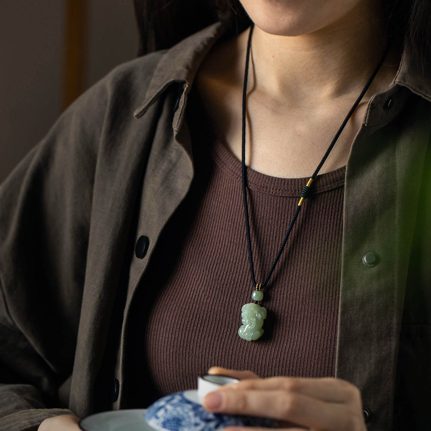 新中式国潮风小胖福吊坠项链女轻奢气质高级感黑色绳子锁包锁骨链