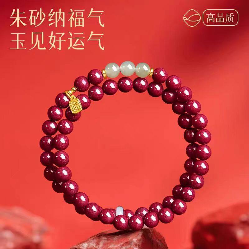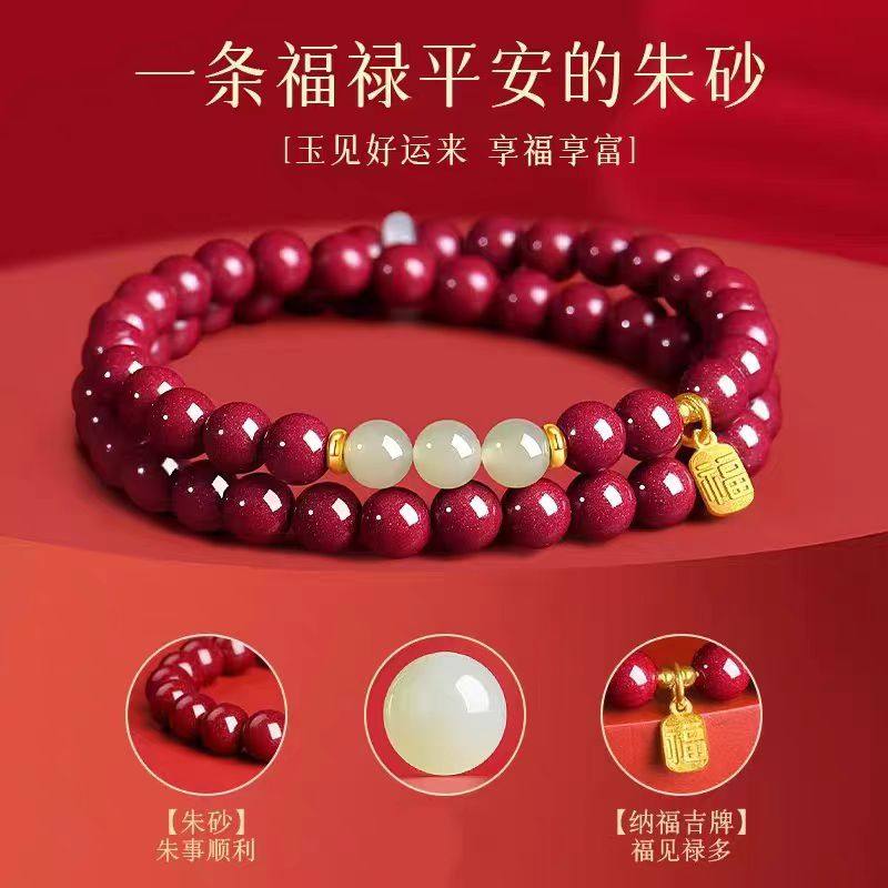 知涵朱砂手串天然原矿朱砂多圈手链和田玉蜜蜡南红小福牌礼物