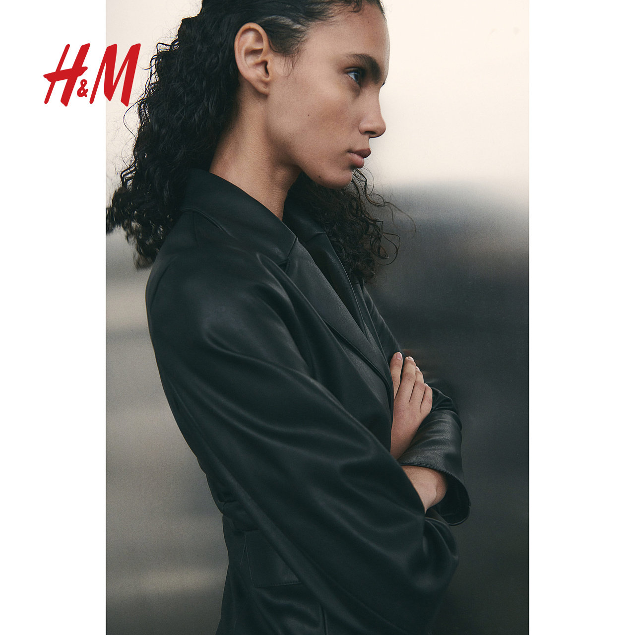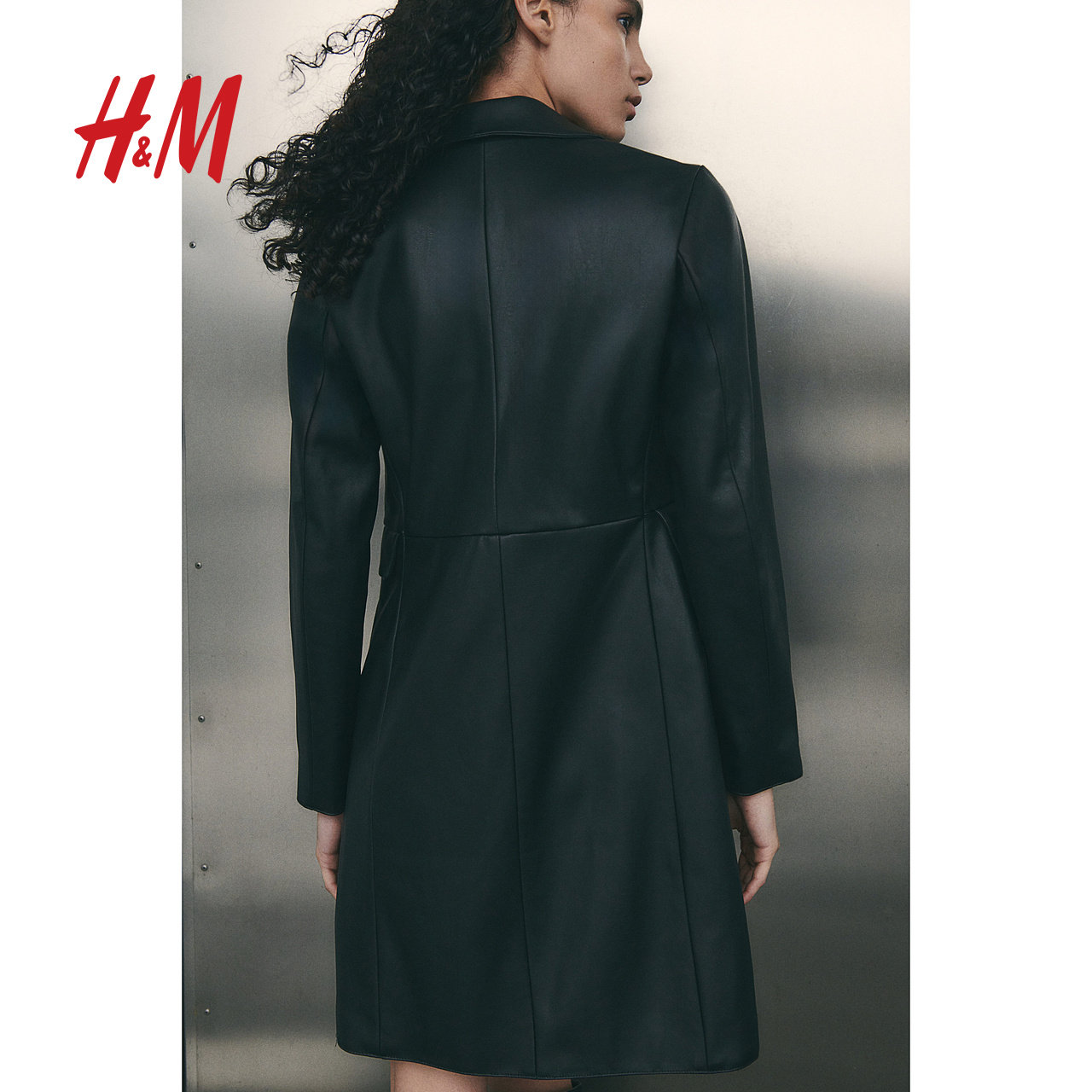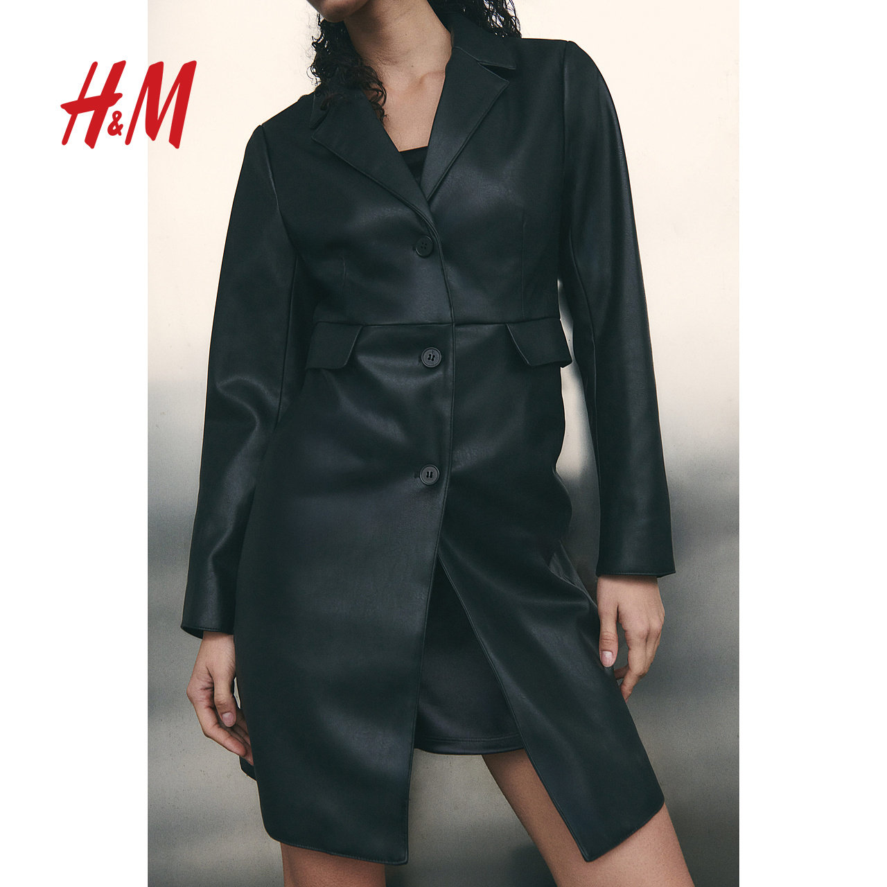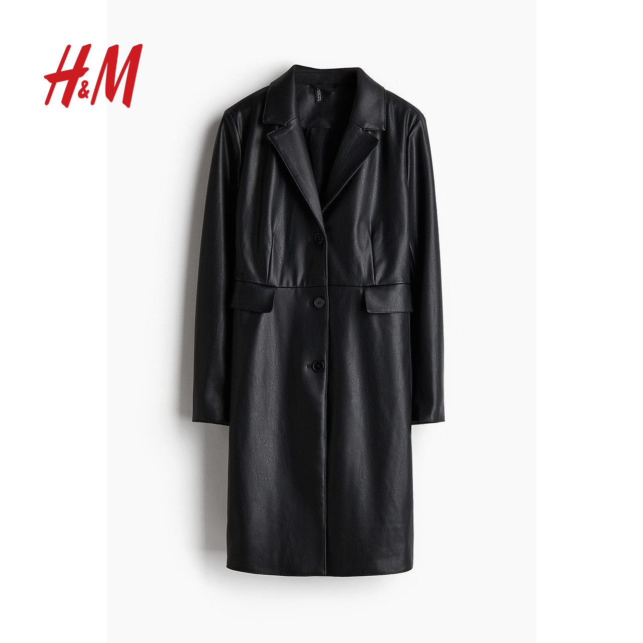 HM女装皮衣冬季时尚通勤休闲保暖单排扣长款外套涂层大衣1255571