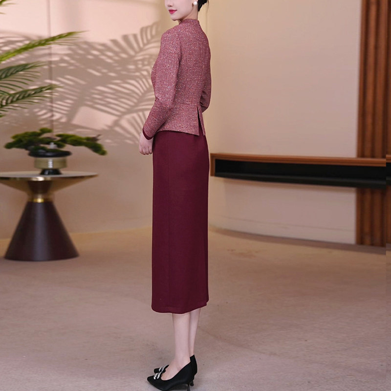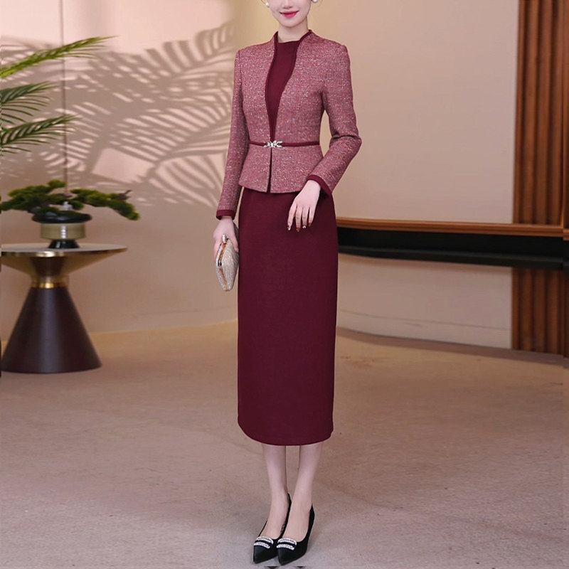 酒红色假两件连衣裙喜妈妈喜婆婆婚宴装2025冬新款气质修身一步裙