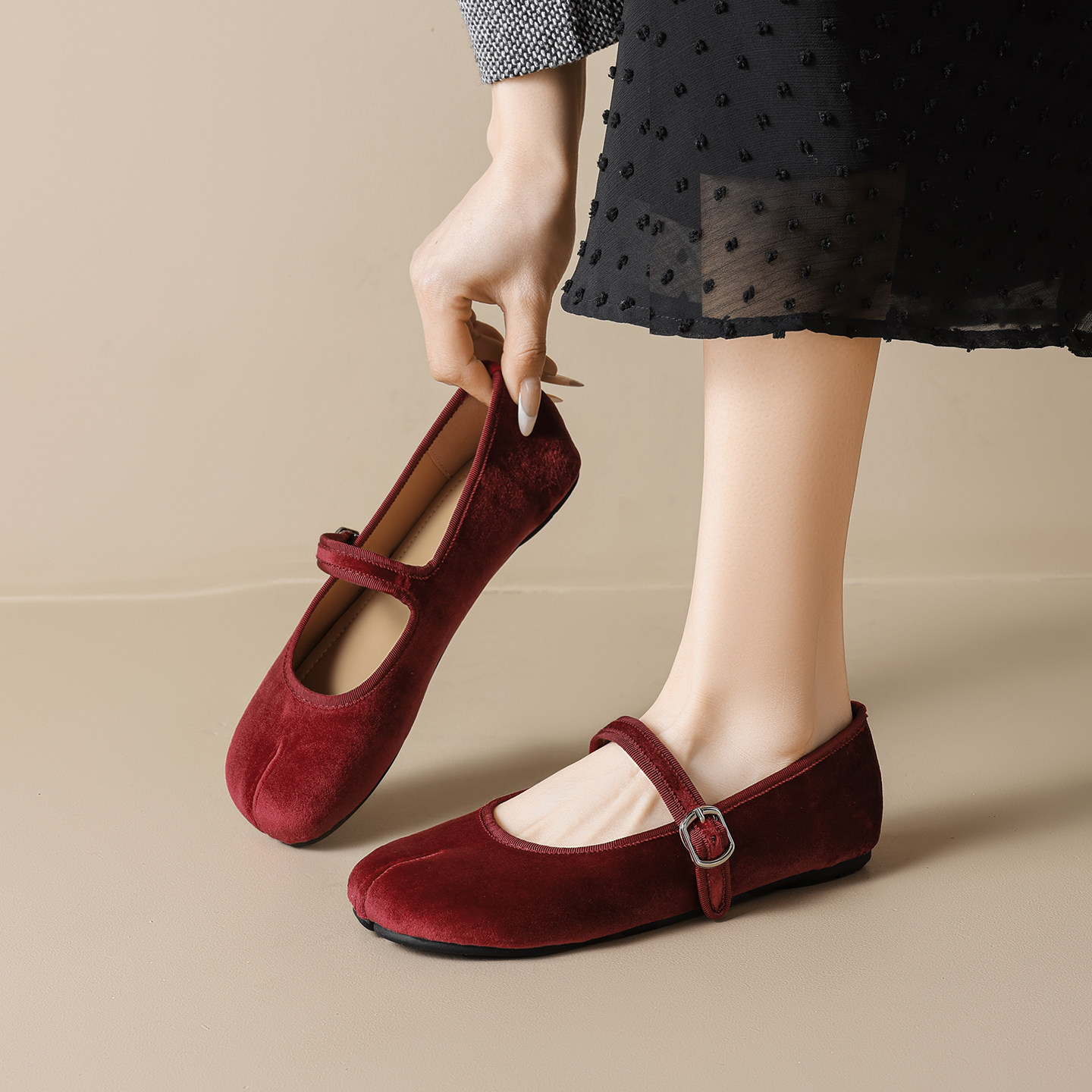 米霏~【羊皮版】红色单鞋女平底法式气质软底芭蕾瓢鞋温柔晚晚鞋