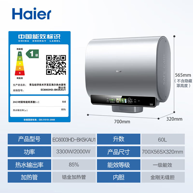 海尔电热水器双胆扁桶家用BK5小蓝瓶净水洗速热一级节能效60升