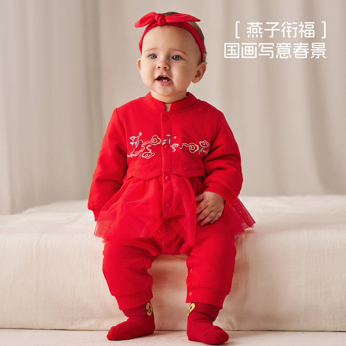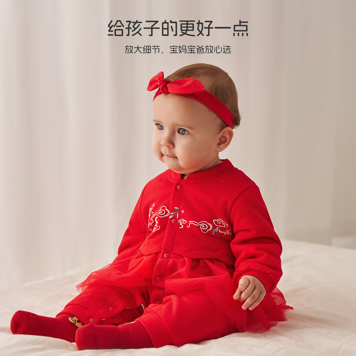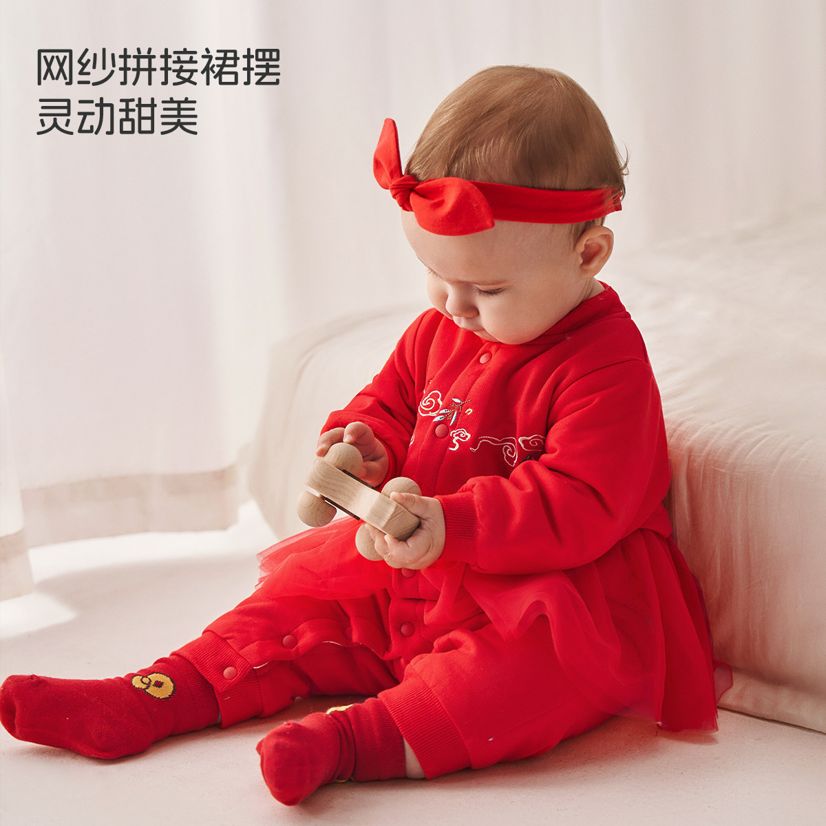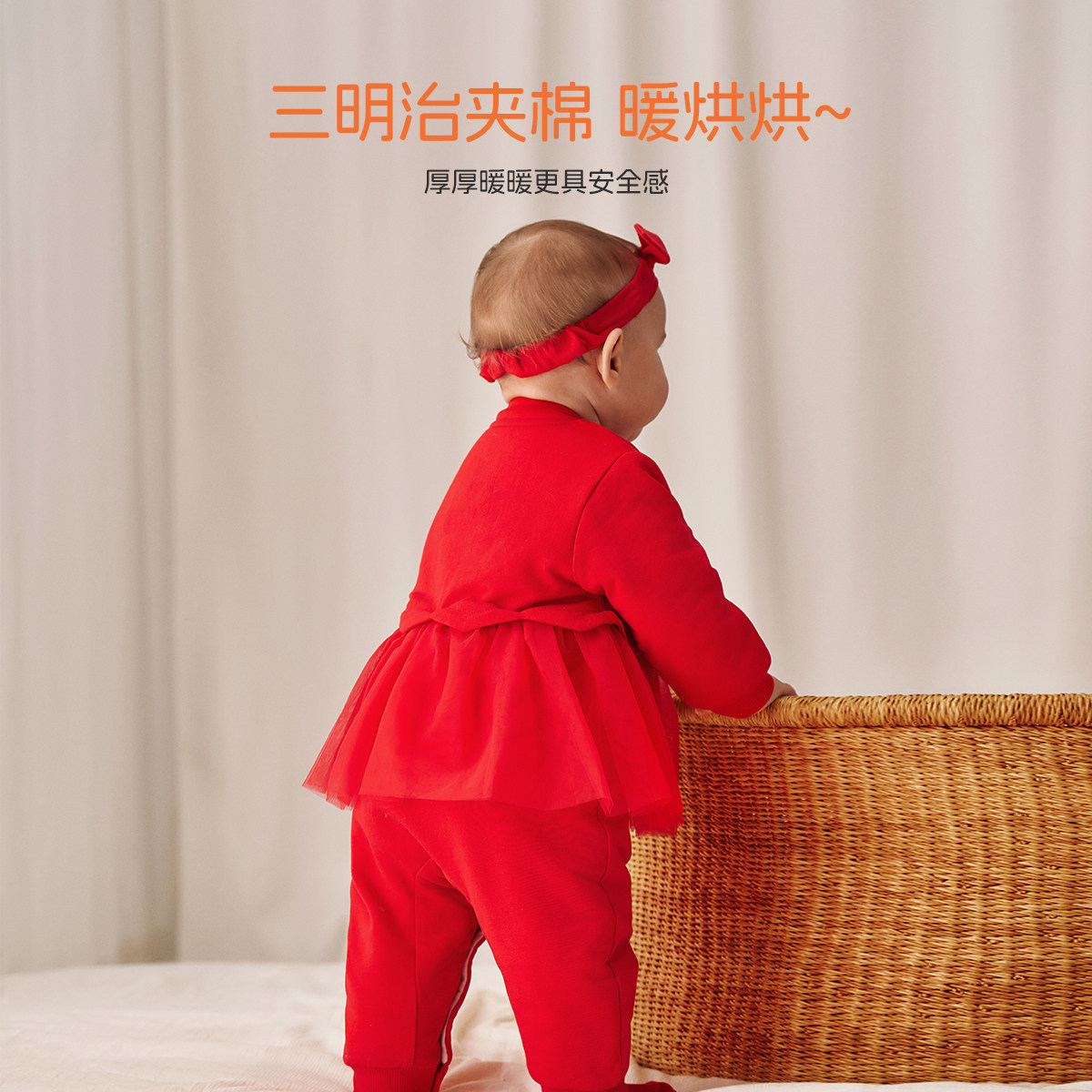 aqpa婴儿衣服夹丝夹棉秋冬保暖宝宝连体衣哈衣新年周岁满月外出服