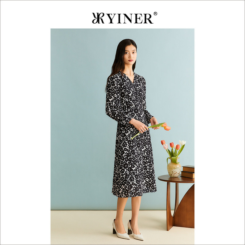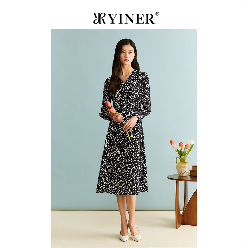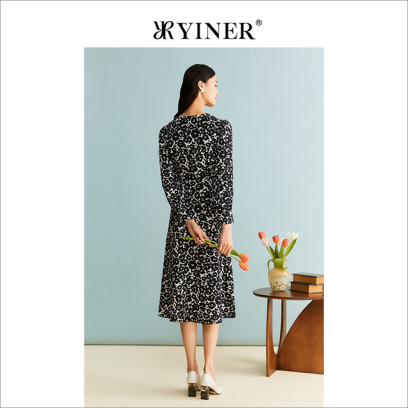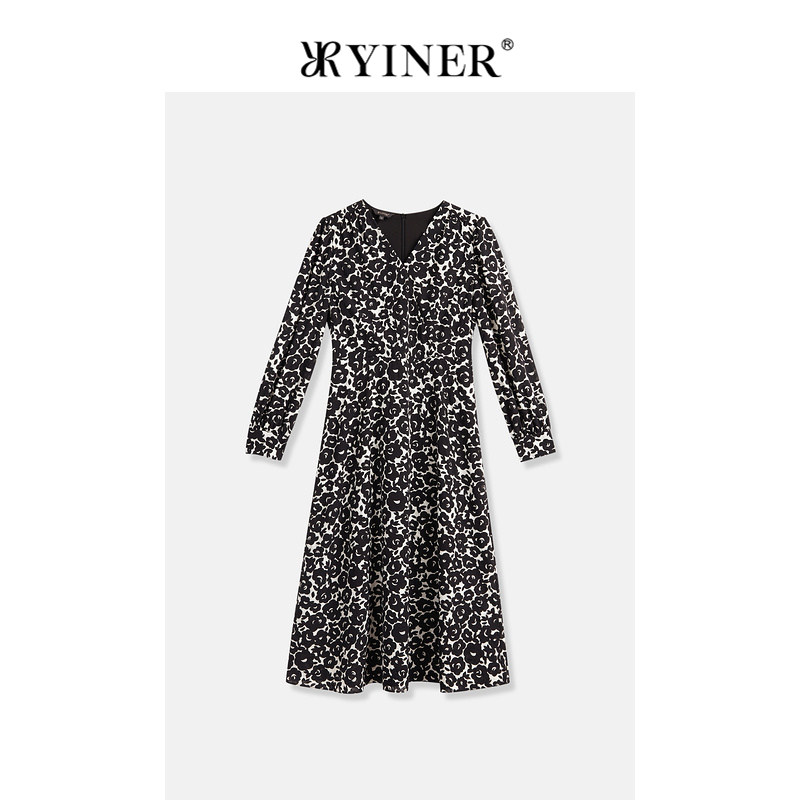 YINER音儿专选女装秋季花朵印花V领收腰公主袖连衣裙
