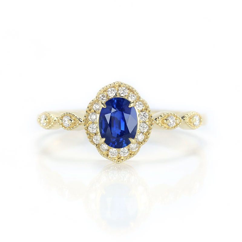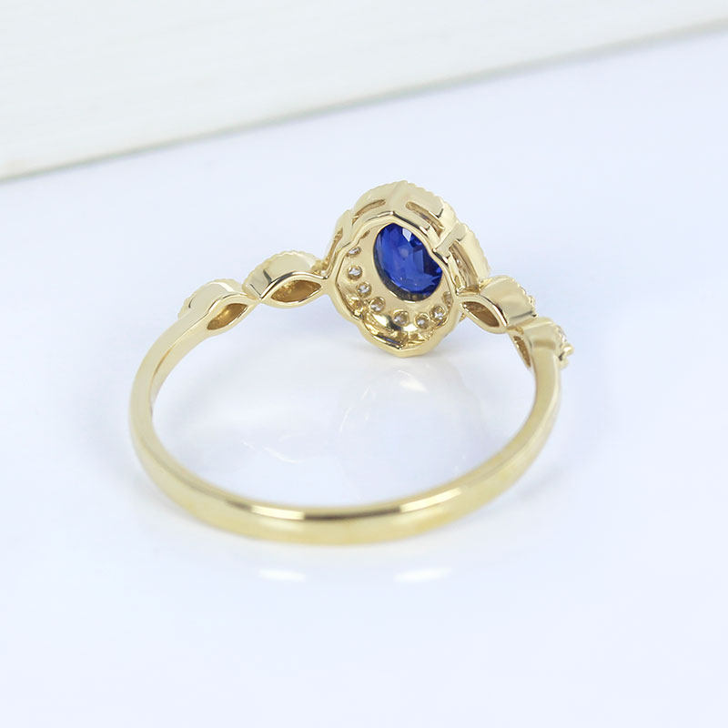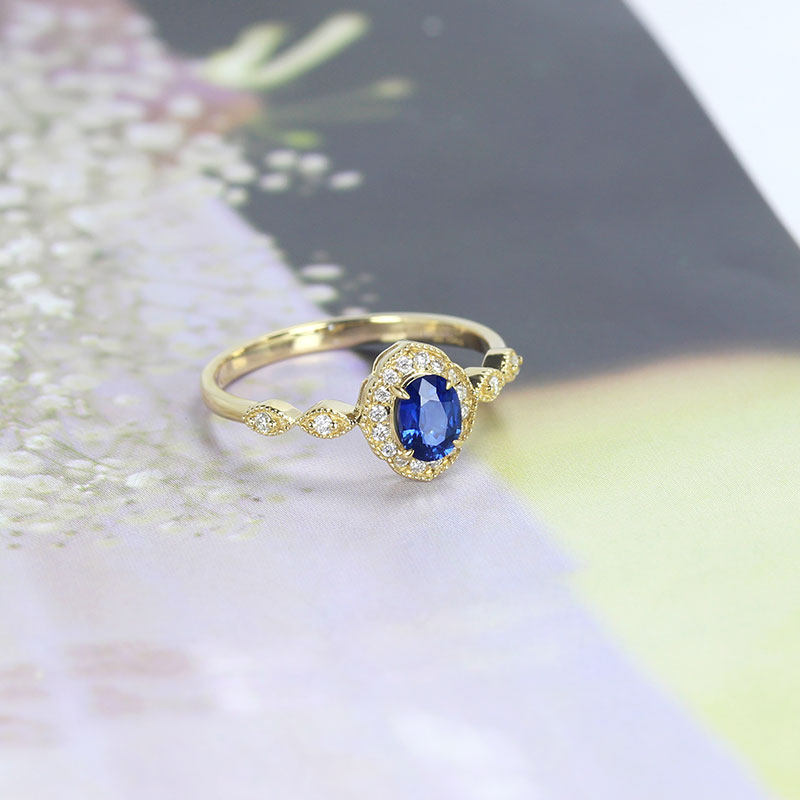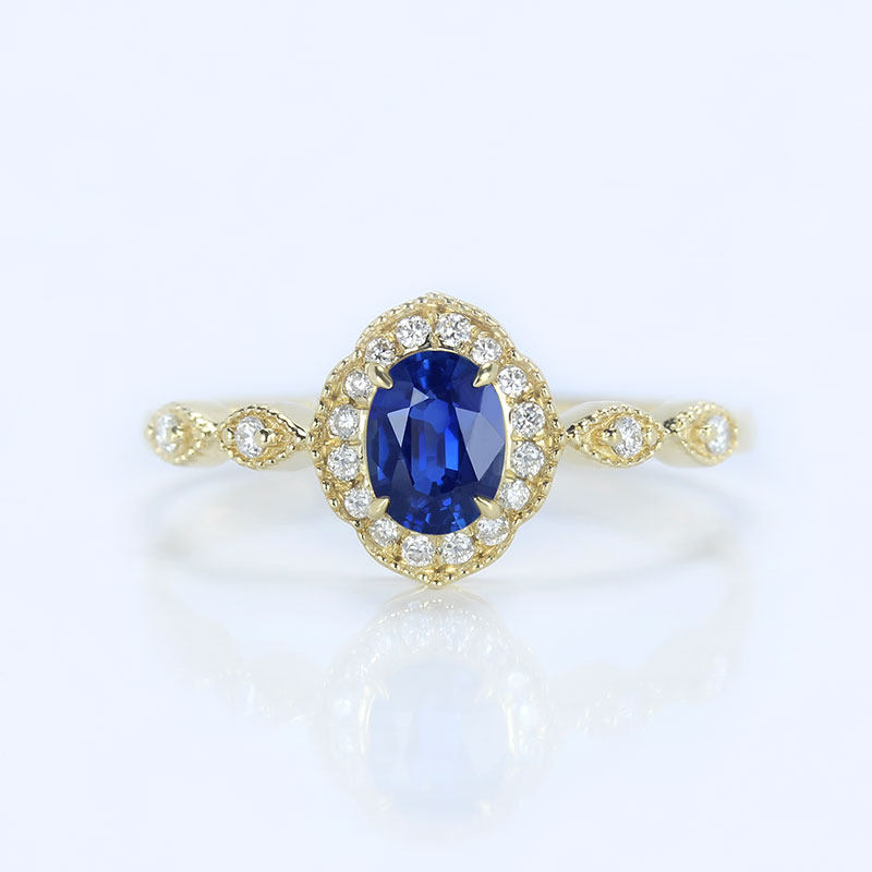 G18K黄金天然皇家蓝宝石复古蕾丝戒指 正蓝色镶钻石彩金花朵女款