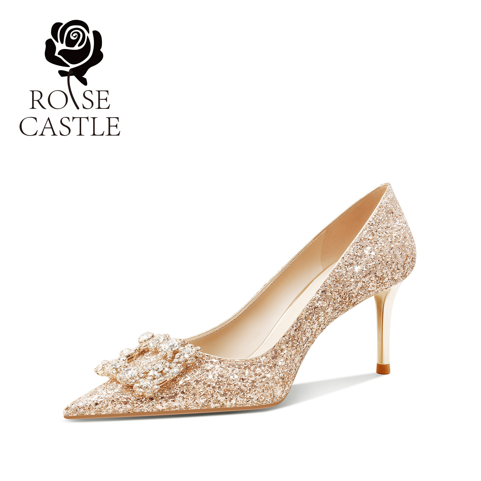 rosecastle婚鞋女禾秀婚纱两穿宴会礼服水晶高跟金色婚鞋新娘单鞋