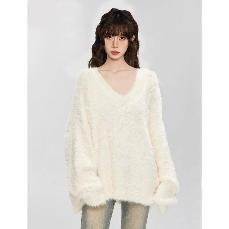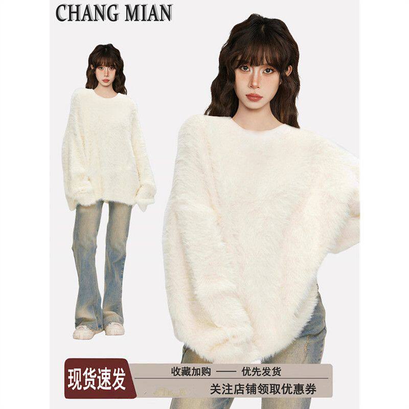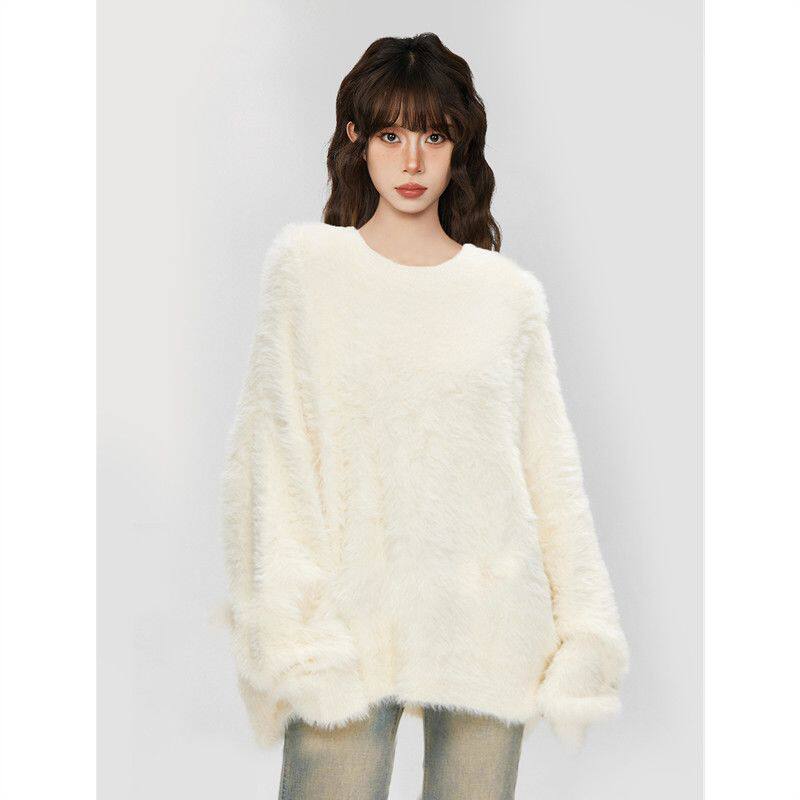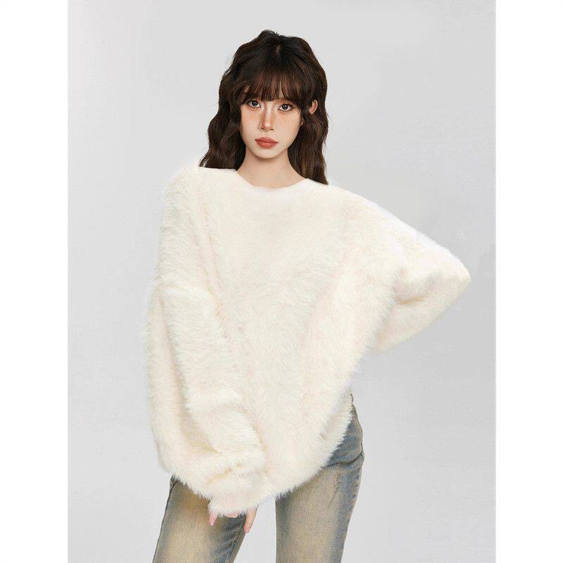 白色套头水貂绒毛衣女秋冬季加绒加厚奶呼呼大码内搭马海毛针织衫