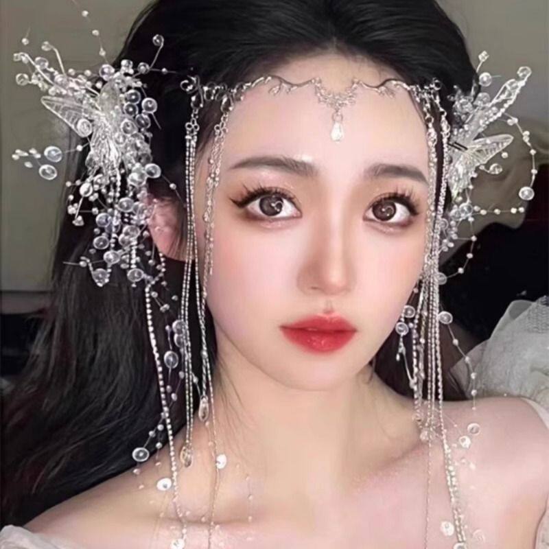 新娘头饰仙气眉心坠蝴蝶结流苏珍珠发夹女仙美森系水晶流苏发饰品