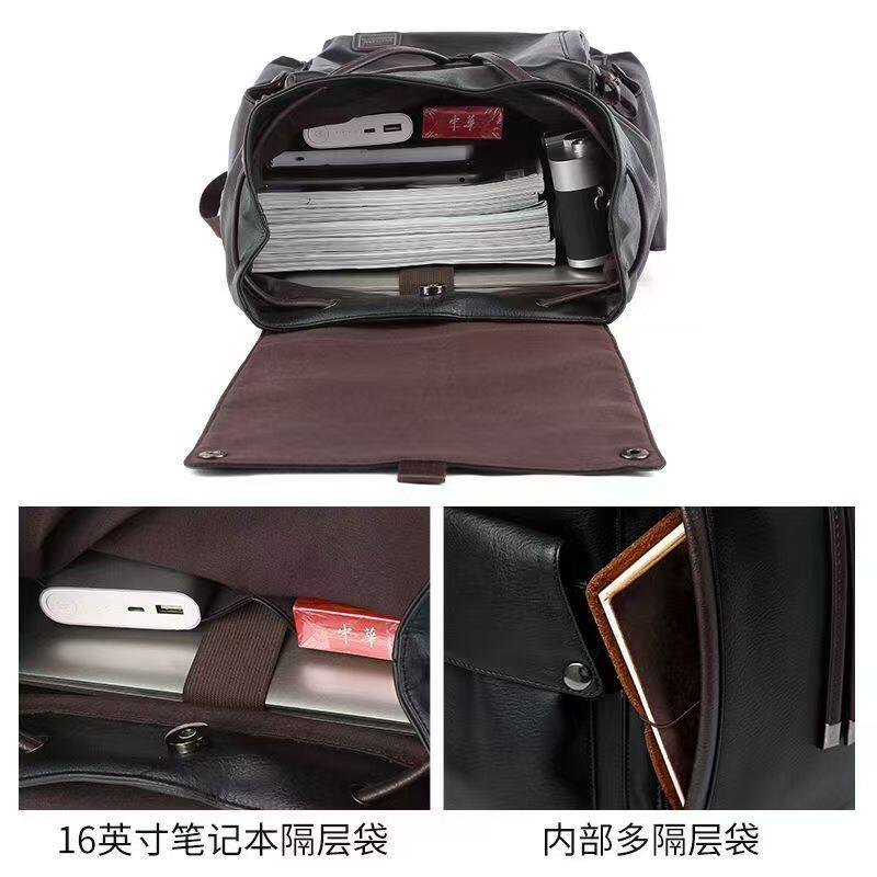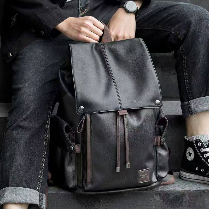 皮质双肩包男时尚背包简约休闲旅行电脑包大学生书包男包防水黑色