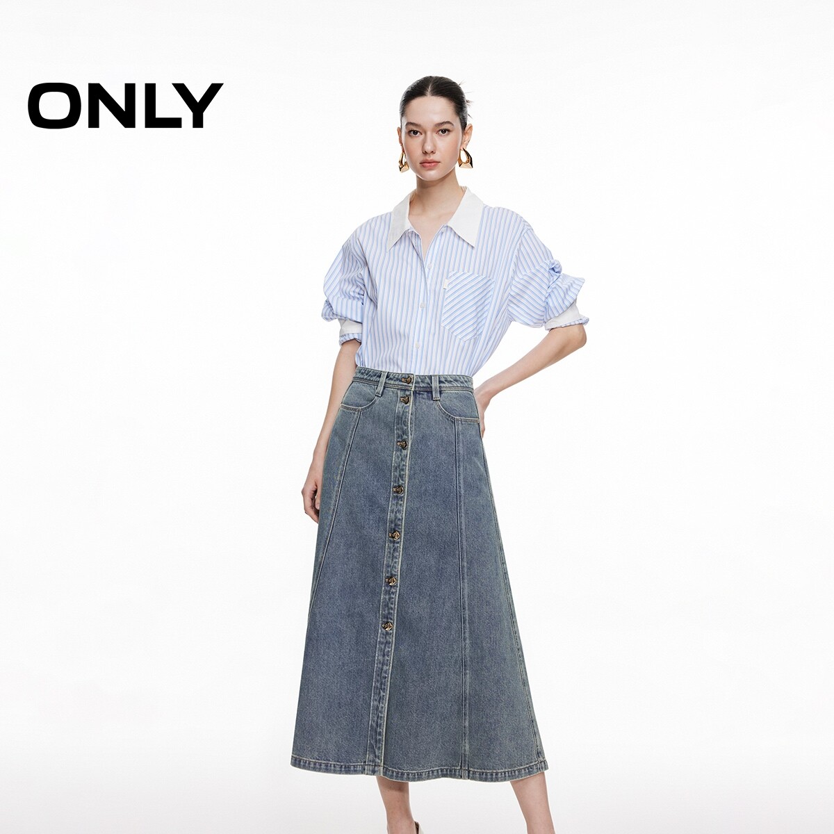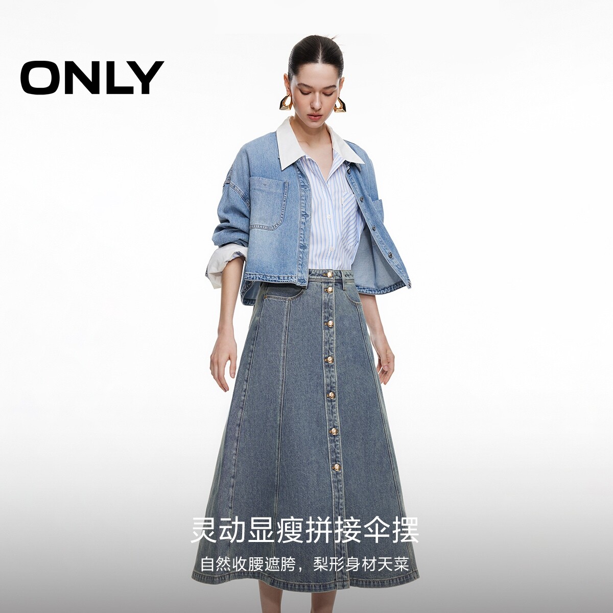 【ONLY奥莱】春款显瘦拼接收腰遮胯高腰A字中长裙牛仔裙半身裙女