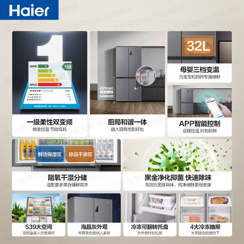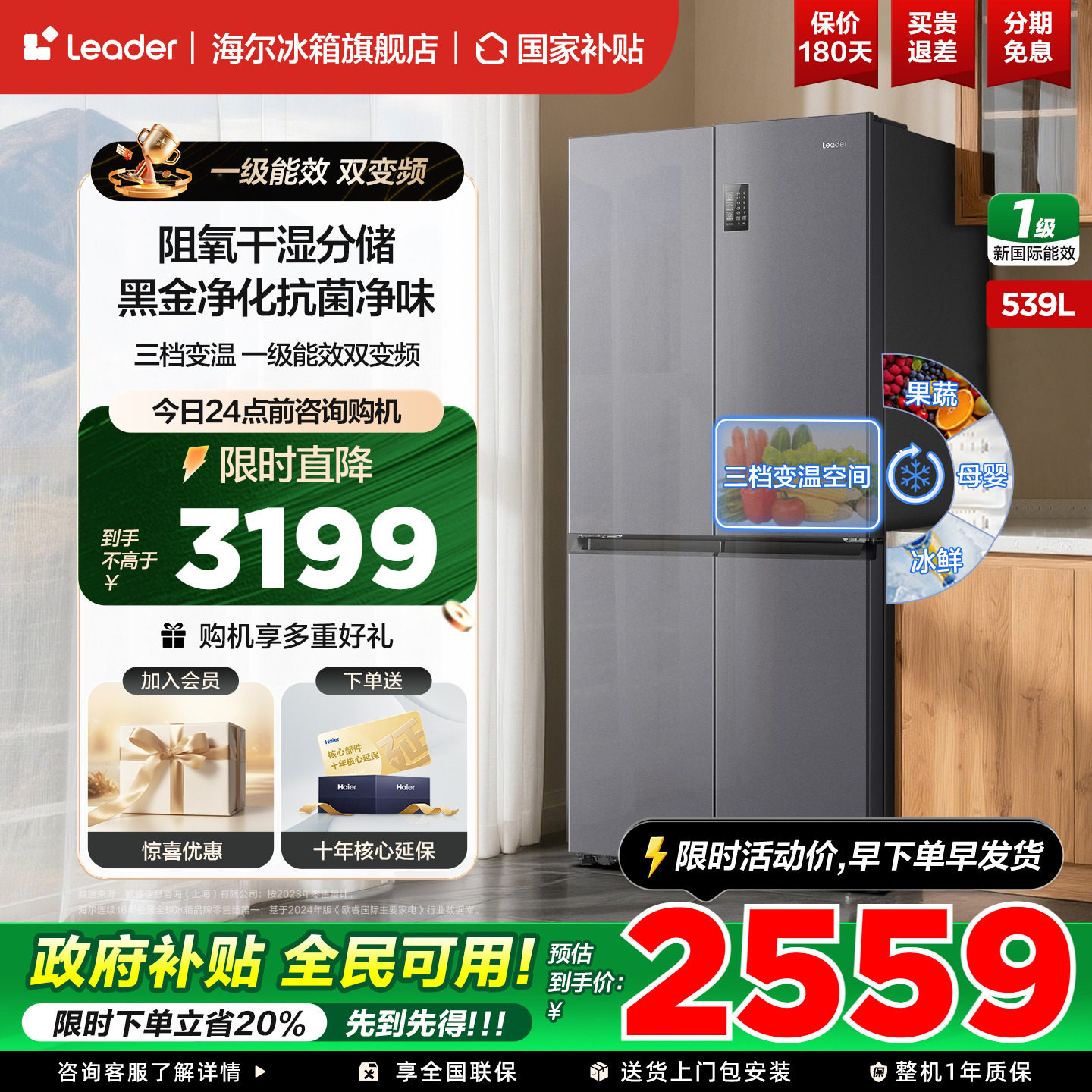 海尔冰箱Leader539升大容量家用十字四开门一级能效无霜官方旗舰