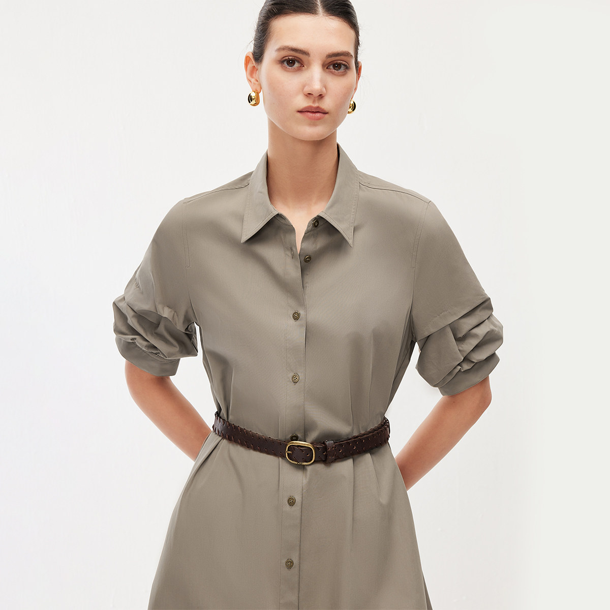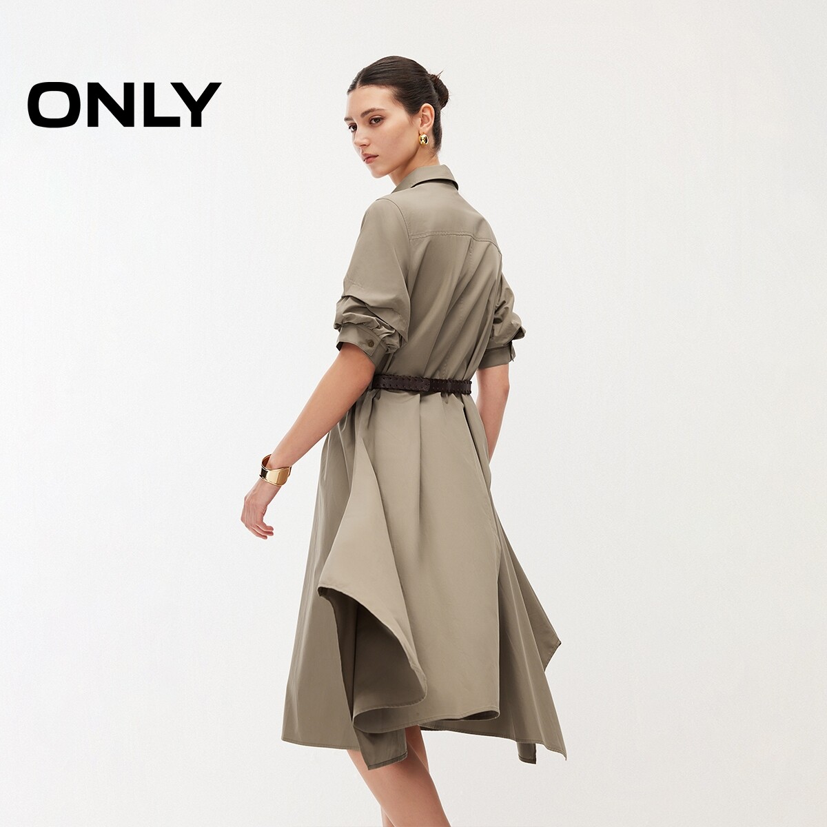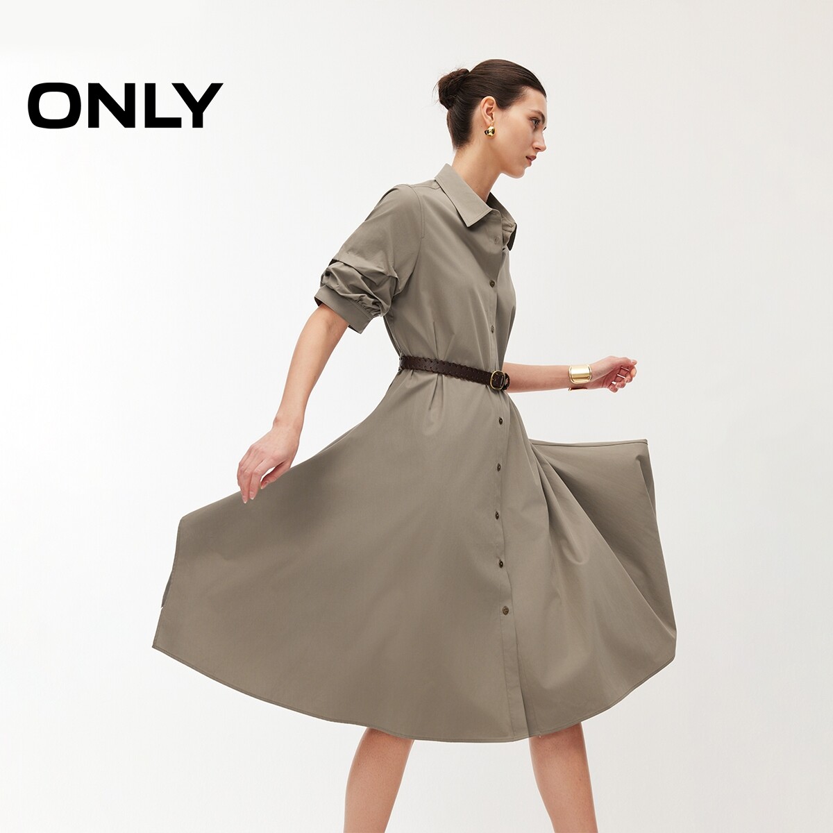 ONLY2026春季新款工装风翻领收腰显瘦中长裙长袖衬衫裙连衣裙女